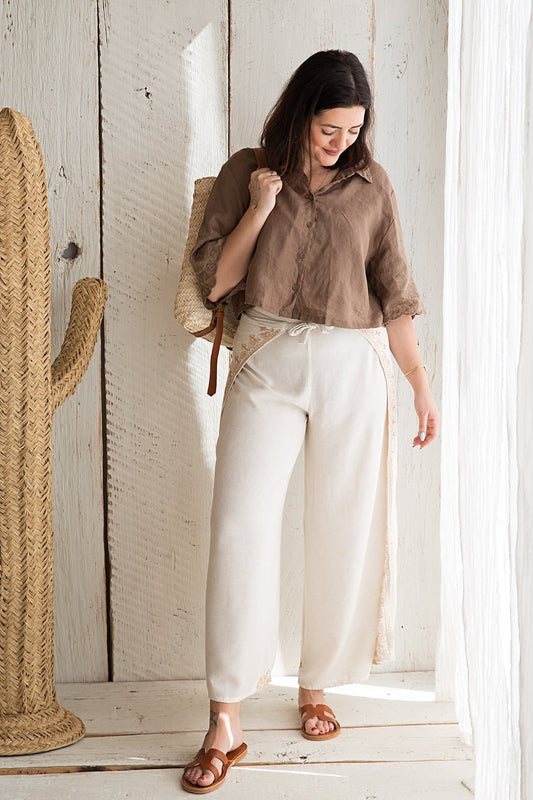 Zavinovací kalhoty bavlna+len hnědé