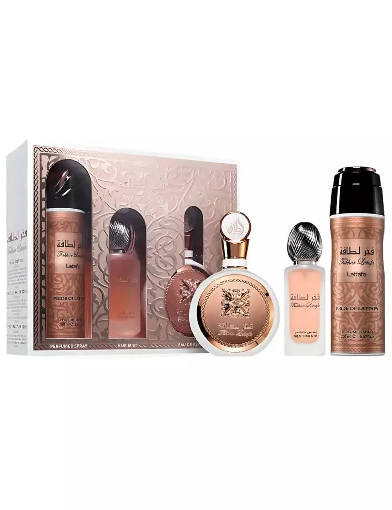 Objevte harmonii ženské krásy a vůně s tímto luxusním sadou Lattafa Fakhar. Tento sofistikovaný set kombinuje plnohodnotnou vůni, jemný sprej do vlasů a deodorant – ideální pro každodenní péči i slavnostní chvíle.