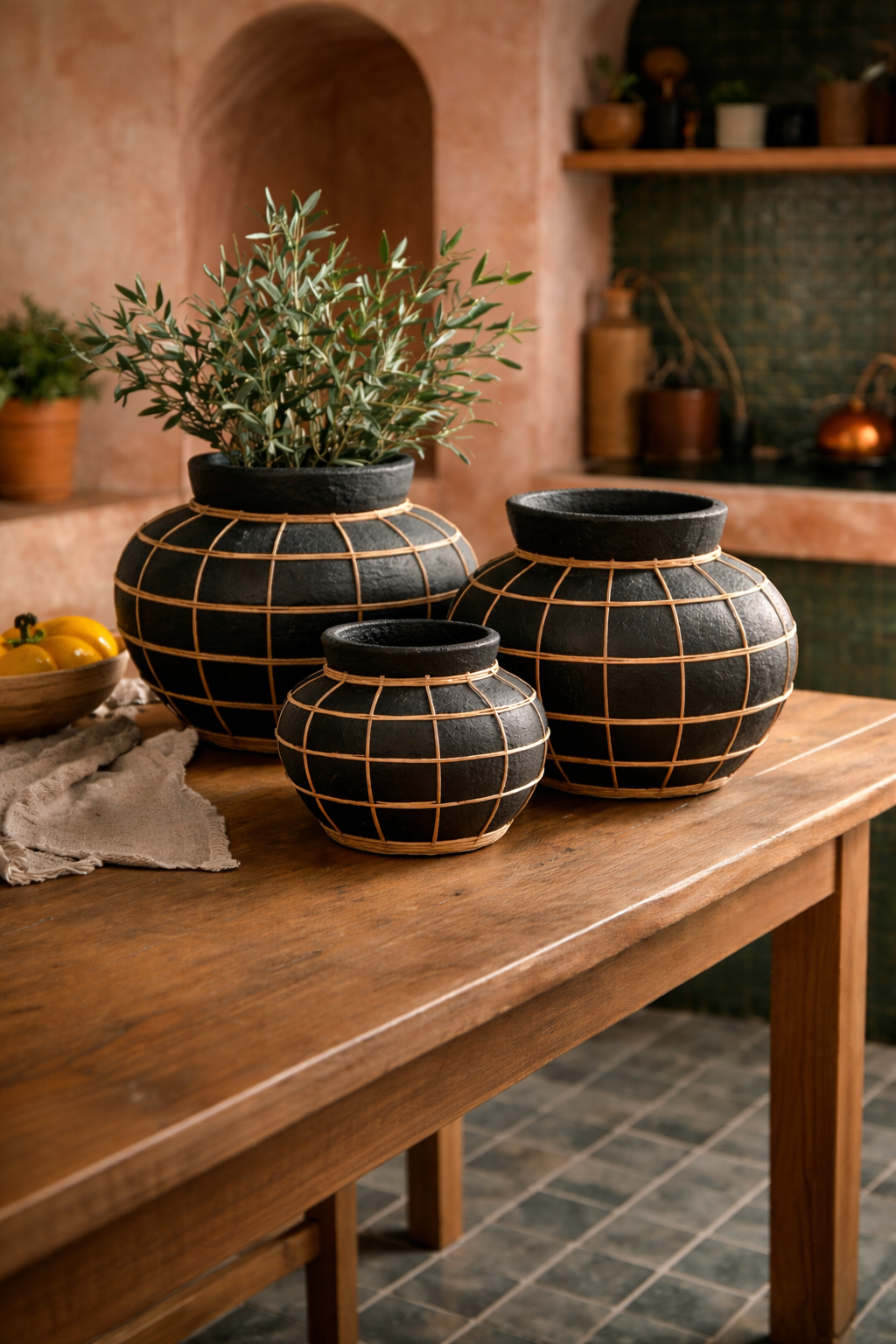 Vneste do interiéru hřejivou atmosféru středomořského stylu s touto výraznou sadou keramických váz. Matně černý povrch v kombinaci s ručně působícím ratanovým opletem vytváří originální kontrast, který zaujme na první pohled. Organický kulatý tvar působí elegantně a přirozeně zároveň, takže vázy krásně doplní moderní, boho i marocky laděné prostory.