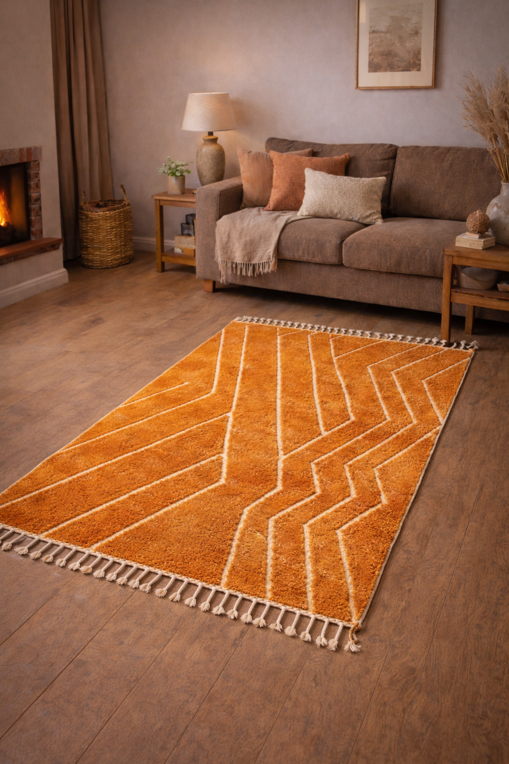 Tento koberec je mistrovským dílem ruční práce z marockého Atlasu, utkaný ze 100% ovčí vlny. Jeho sytá melírovaná oranžová barva působí energicky, hřejivě a výrazně – ideální jako dominantní prvek v interiéru. Čistý design nechává vyniknout samotnou strukturu vlny a bohatost barvy.
