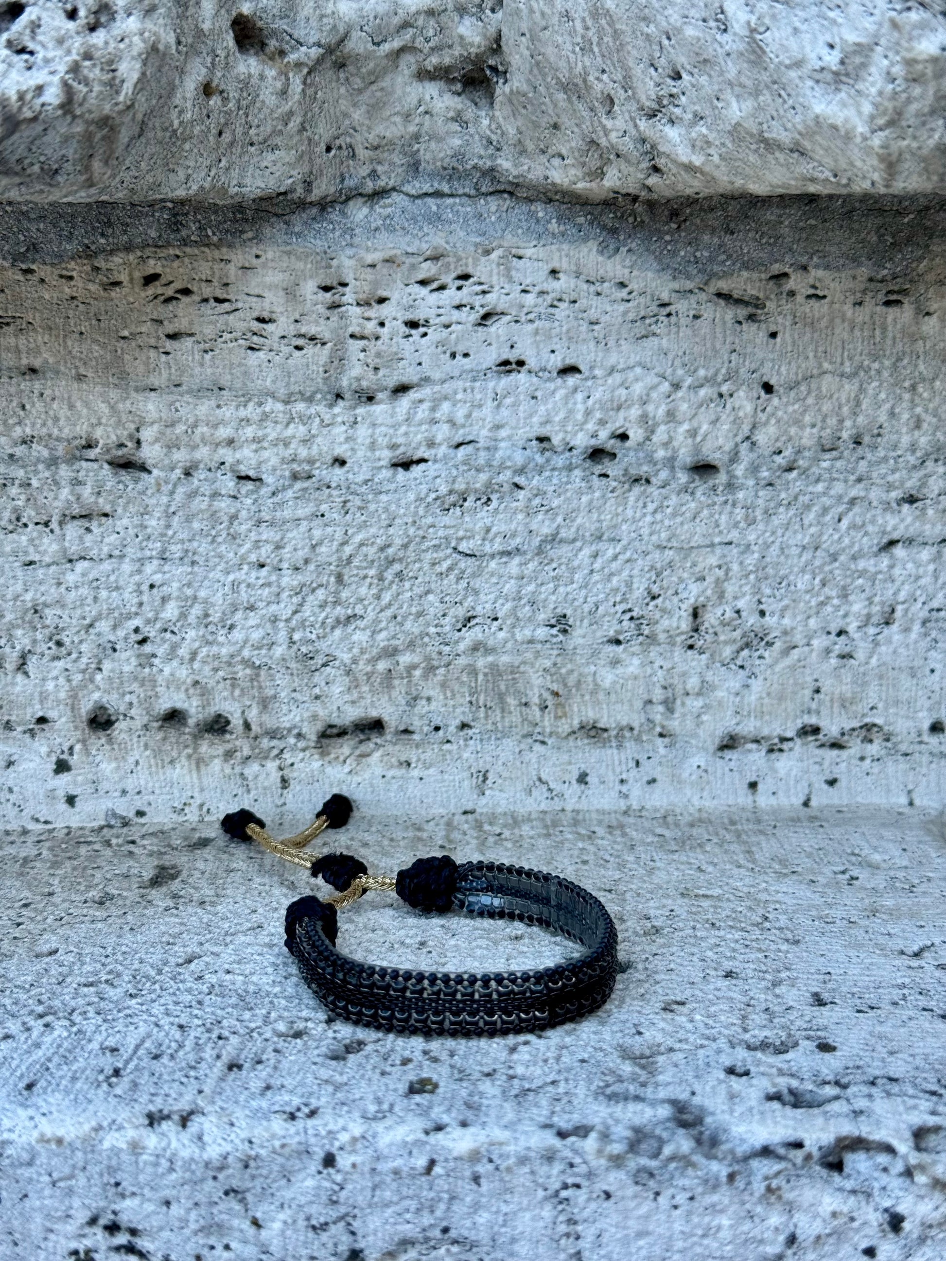 Jednoduchý, tenký náramek z drobných černých kamínků na posuvné šňůrce. Minimalistický design, který se hodí ke každému outfitu – ať už samostatně, nebo jako součást vrstvení více náramků.