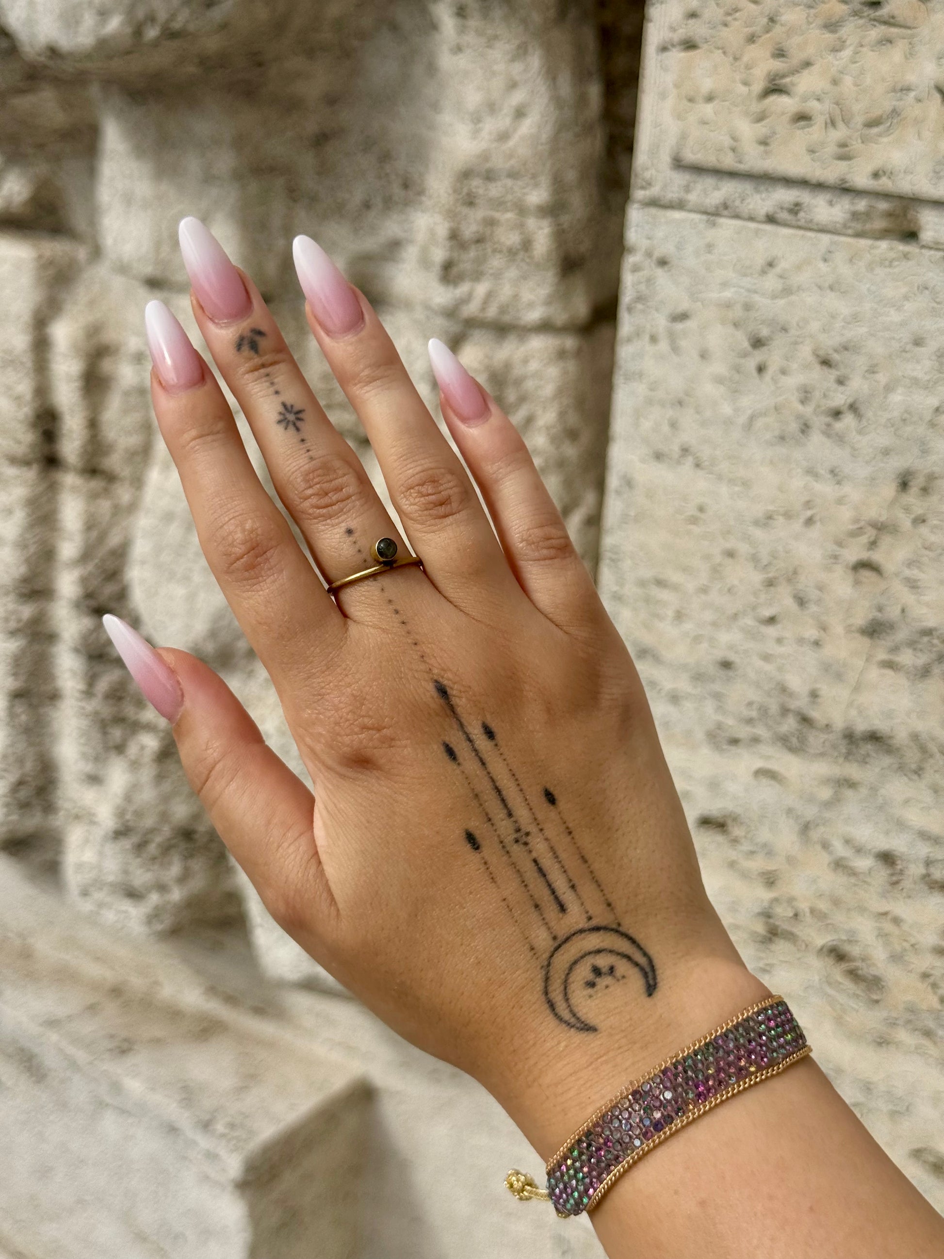 Elegantní ručně vyráběný náramek zdobený jemnými krystaly v sytých tónech fialové, švestkové, zelené a temně růžové. Barevnost působí sofistikovaně a luxusně, zatímco zlaté lemování dodává šperku teplý a orientální charakter. Nastavitelná zlatá šňůrka umožňuje pohodlné nošení na každém zápěstí.