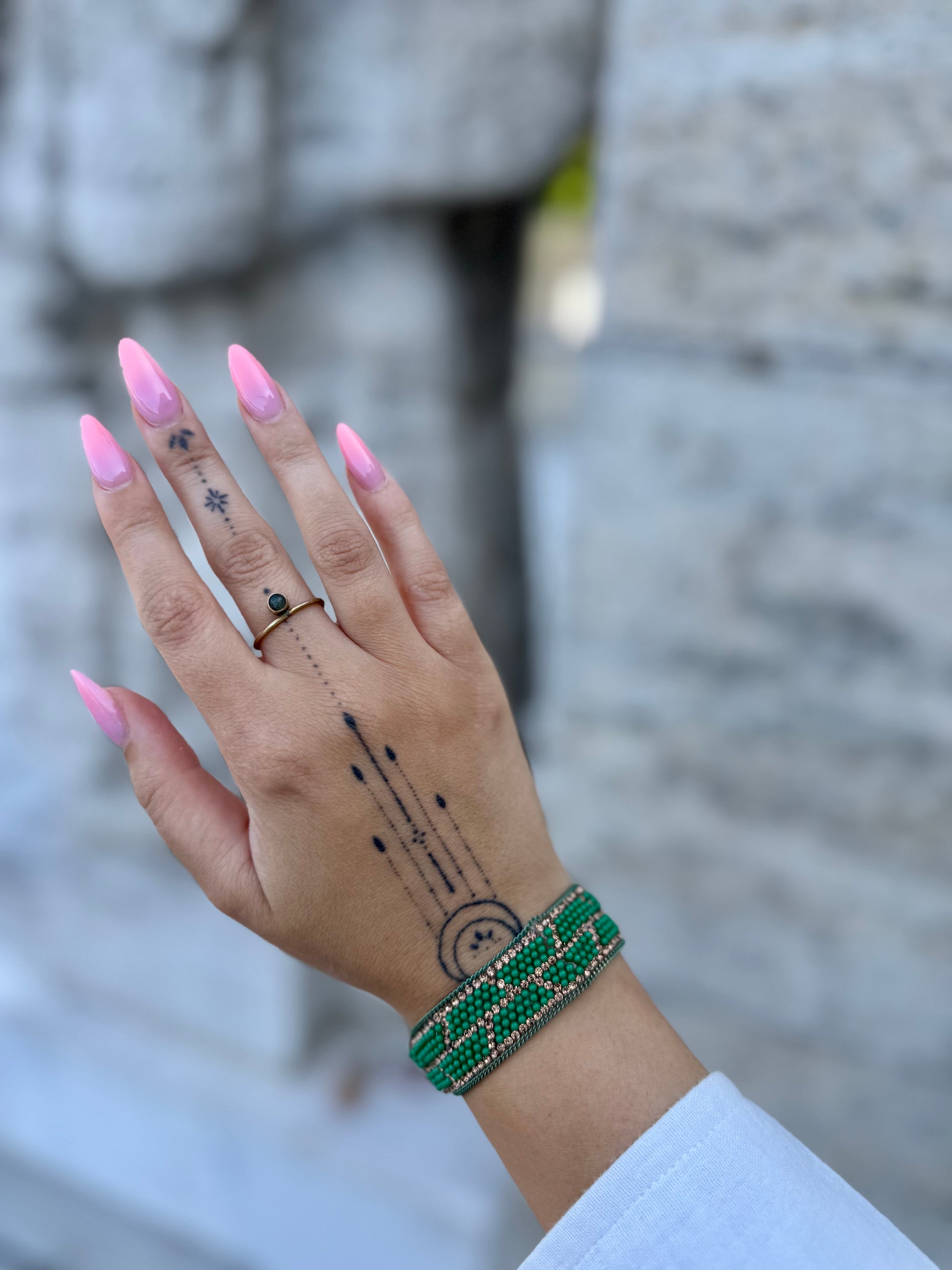 Ručně vyráběný náramek z drobných kamínků v zelených a zlatých odstínech. Barevná kombinace působí svěže a přírodně – perfektní volba pro milovníky originality a boho stylu.