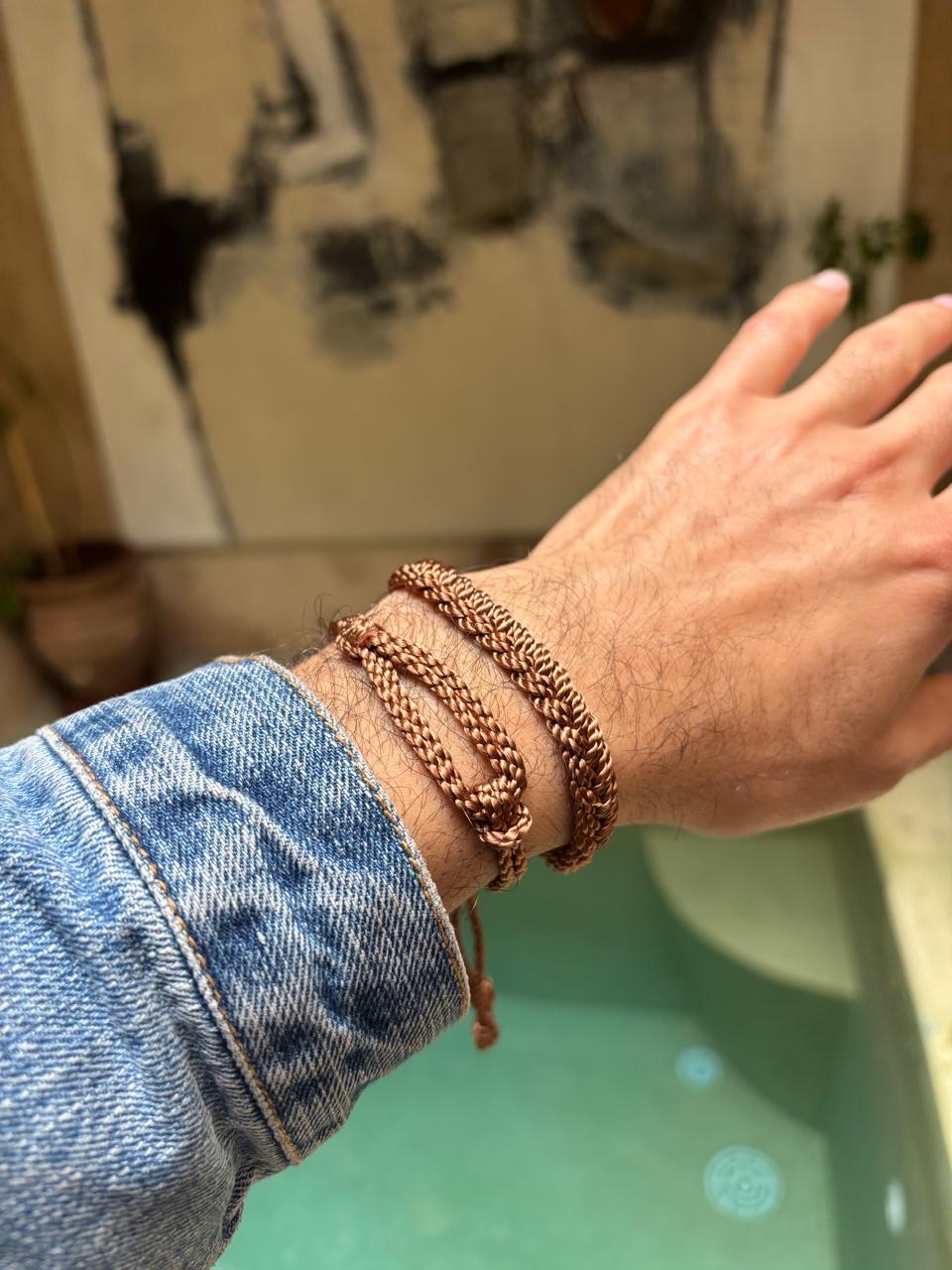 Stylový ručně pletený pánský náramek z jemných, ale pevných hedvábných nití. Díky stahovacímu zapínání se snadno přizpůsobí každému zápěstí – nemusíte se bát, je dostatečně velký a pohodlný na nošení. Lehký, odolný a ideální pro každodenní nošení i vrstvení s dalšími doplňky.