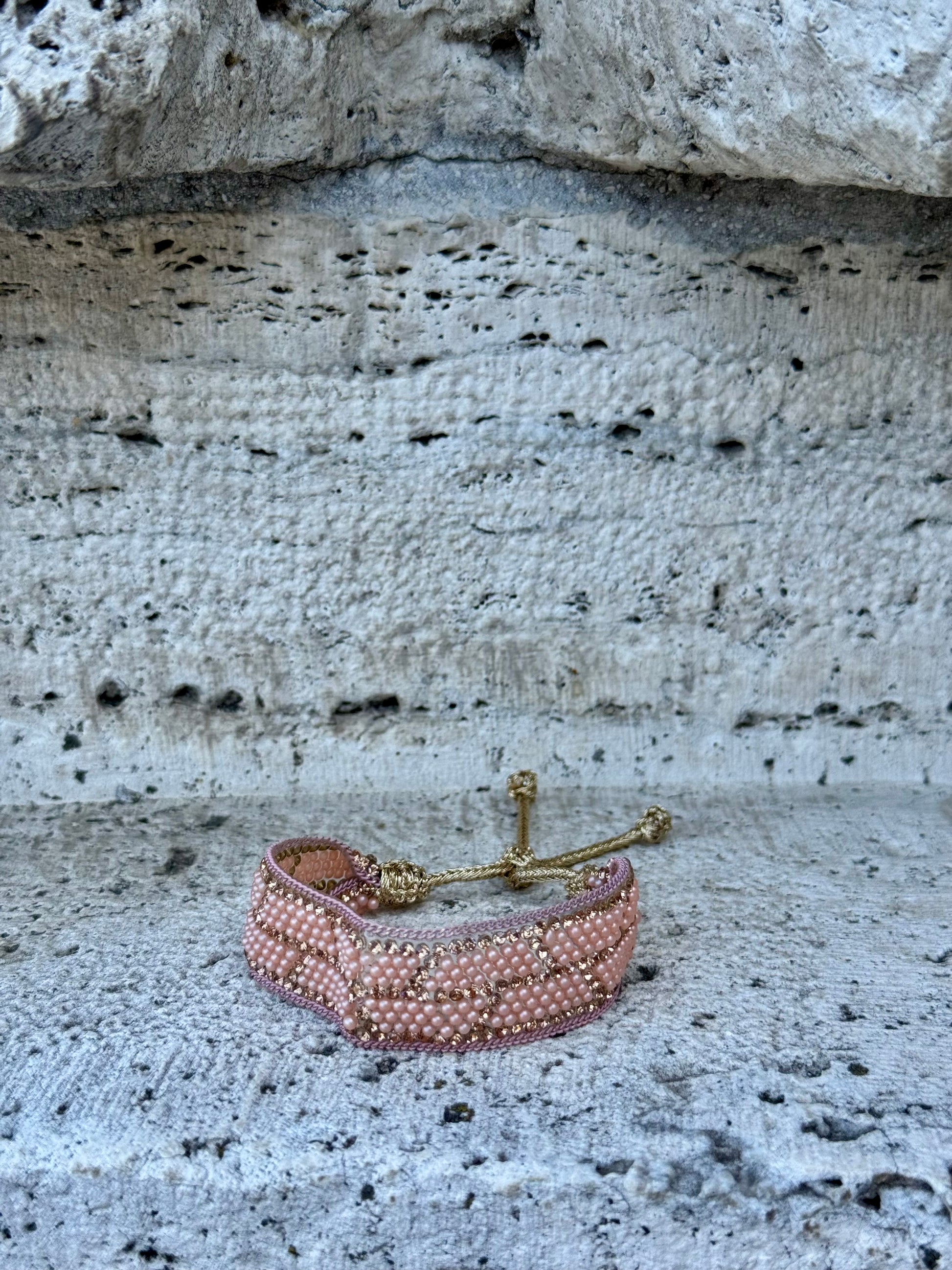 Romantický náramek zdobený růžovými a jemně zlatými kamínky. Přináší do outfitu ženskost, něhu a lehký šmrnc. Skvělý doplněk pro každodenní nošení i speciální příležitosti.