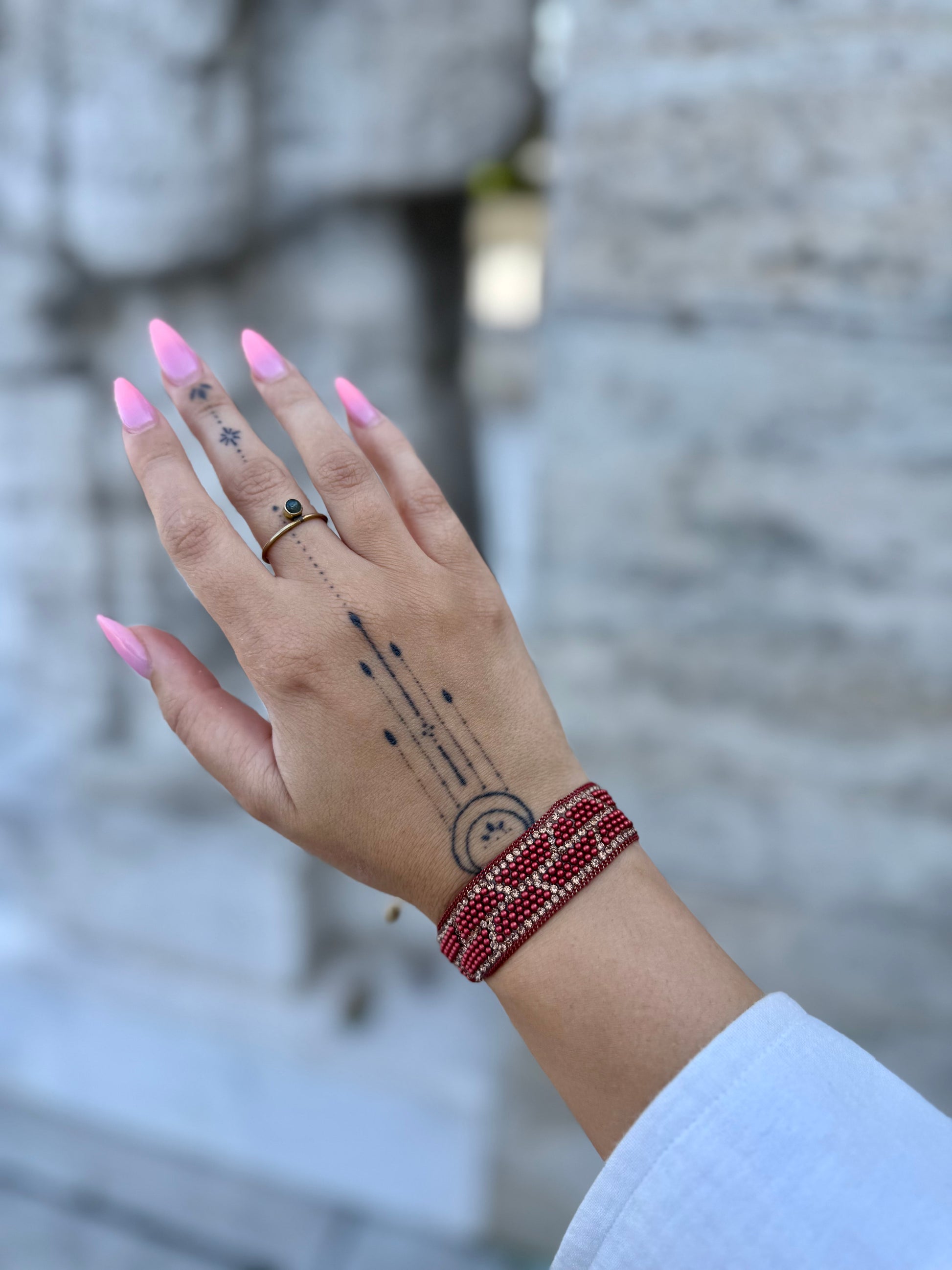 Výrazný náramek v kombinaci sytě červených a zlatých kamínků. Živý barevný kontrast podtrhne vaši energii a ženskost – ideální doplněk na léto, festivaly i večerní akce.