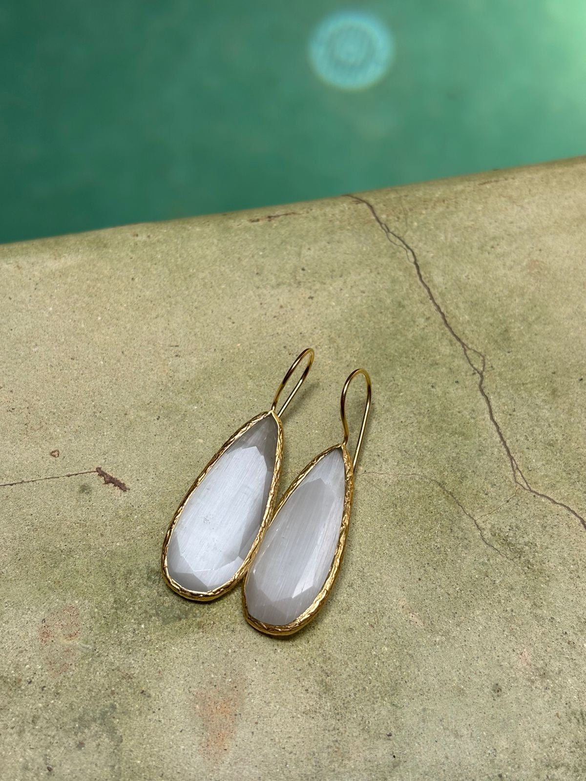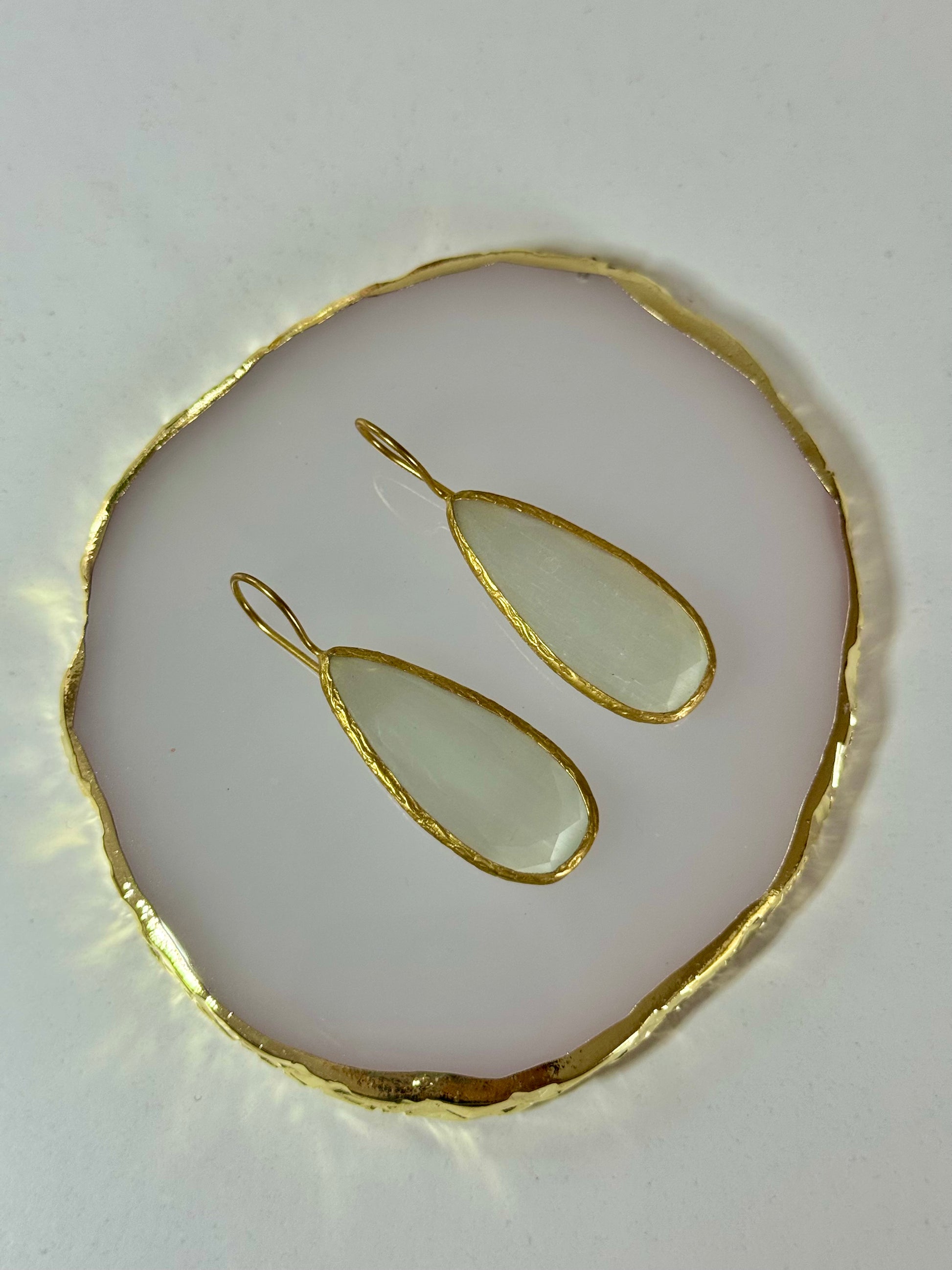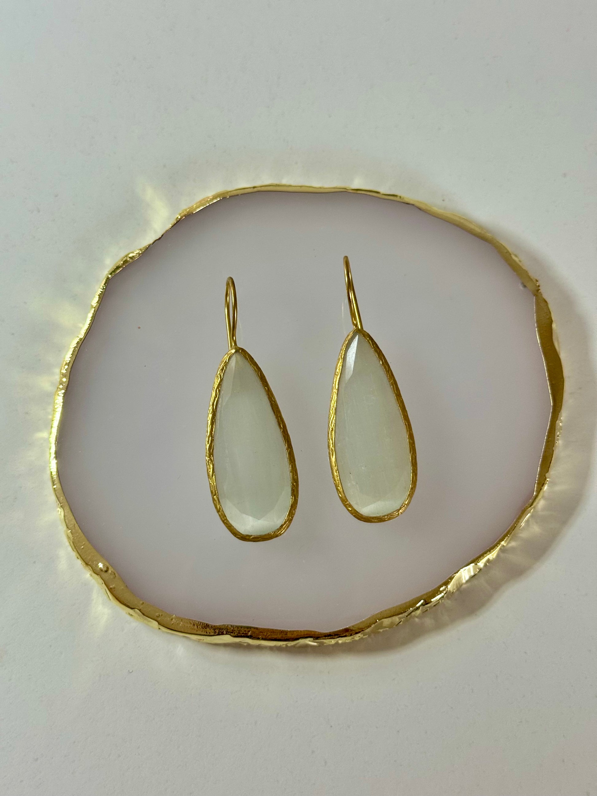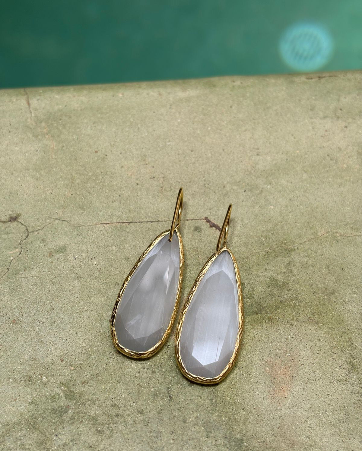 Jemné jako měsíční svit na kůži. Tyto visací náušnice s mléčně bílým kamenem září čistotou, klidem a lehkostí. Kapkovitý tvar, ručně zpracovaný pozlacený rámeček a decentní lesk z nich dělají ideální doplněk pro chvíle, kdy chceš zazářit tiše.