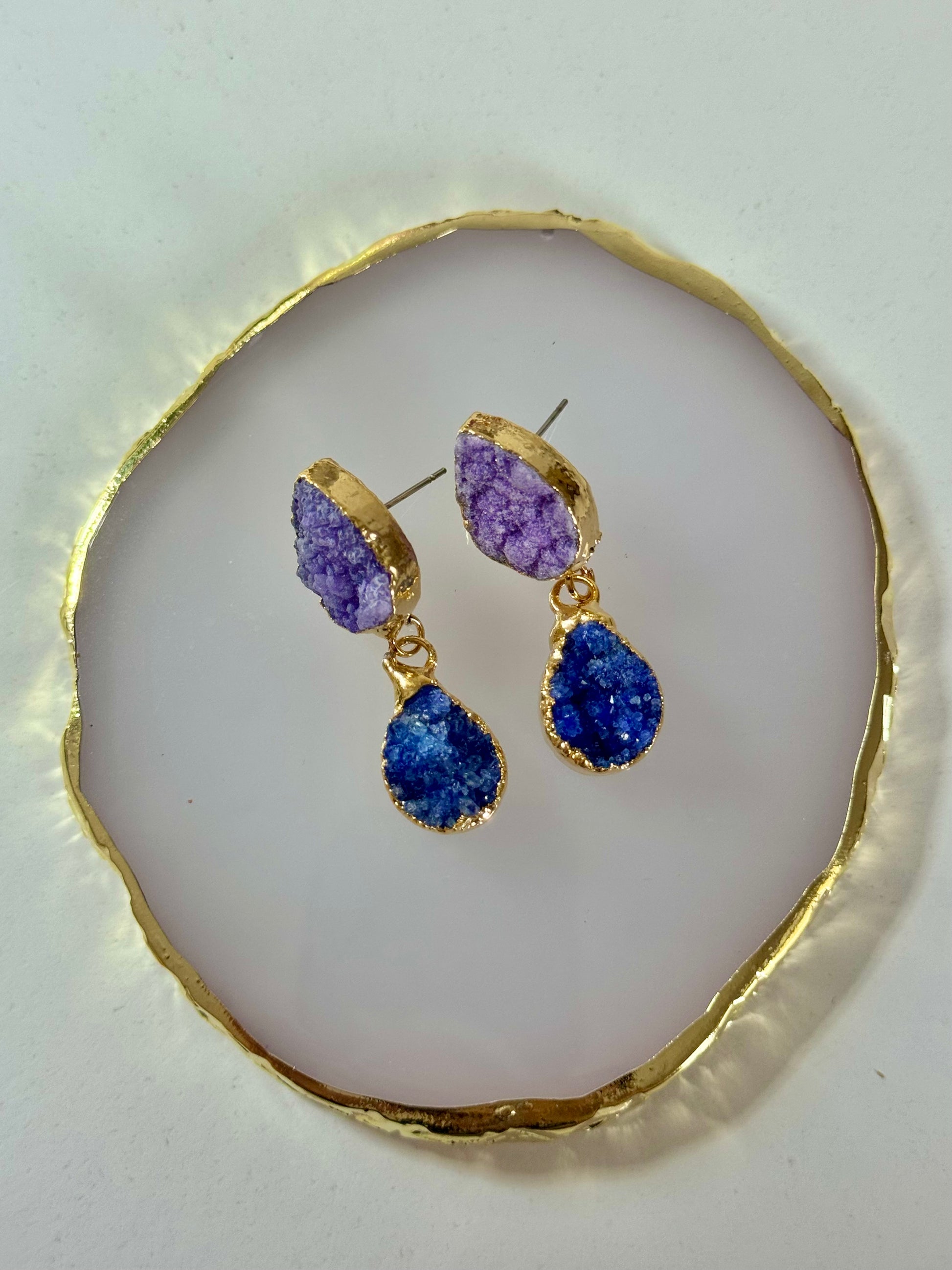 Půvabné náušnice z kolekce inspirované surovou krásou minerálů. Kombinace světle fialového kamene s jemnou strukturou a zářivě modrého krystalického povrchu vytváří elegantní kontrast. Každý kámen je zasazen do ručně leštěné pozlacené mosazi, která dodává náušnicím luxusní nádech.