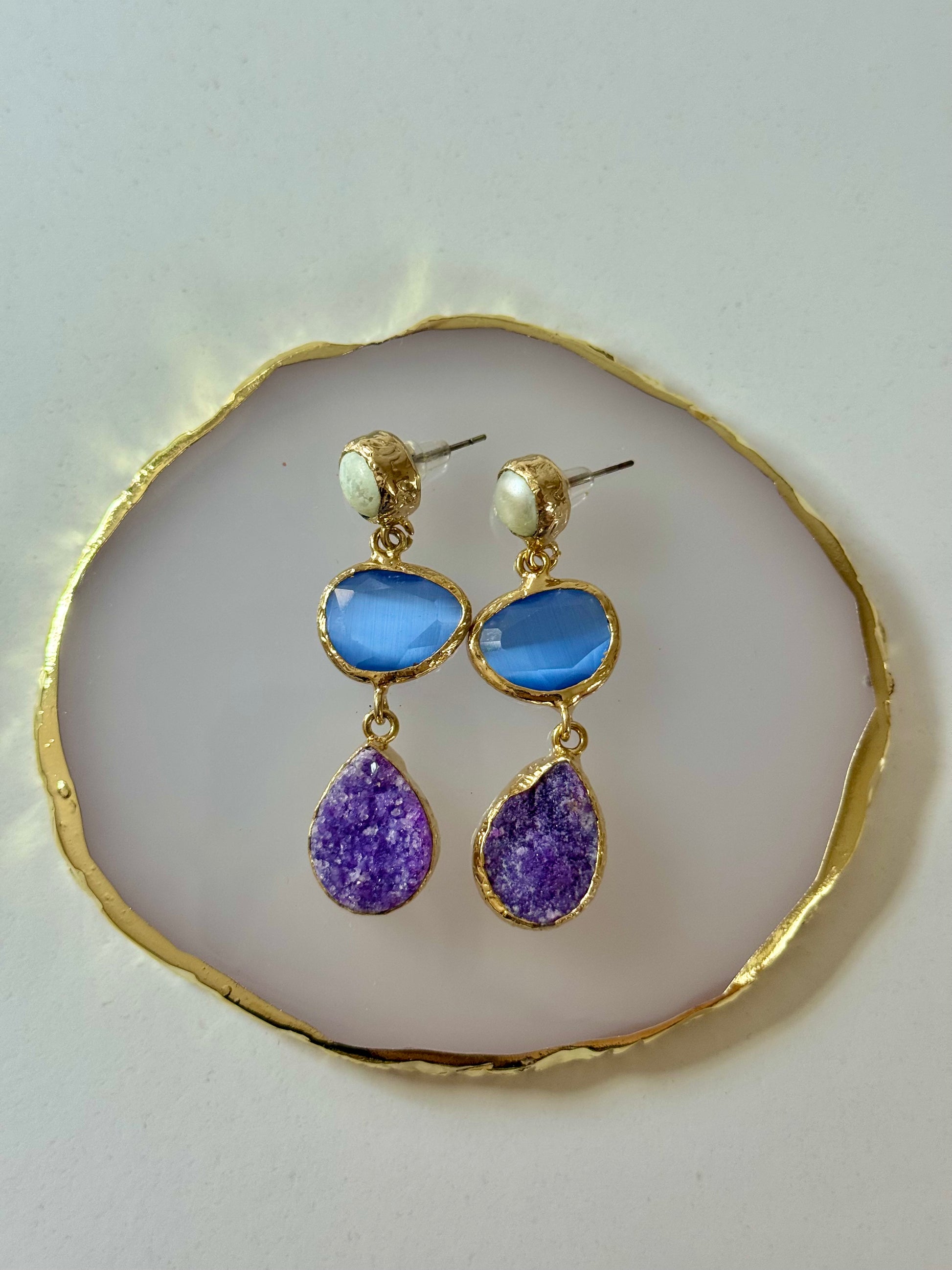 Náušnice, které přitahují pozornost na první pohled. Kombinace nebesky modré pryskyřice a sytě fialového přírodního drúzového kamene vytváří harmonii elegance a originality. Základ tvoří pozlacená mosaz doplněná perleťovým detailem.