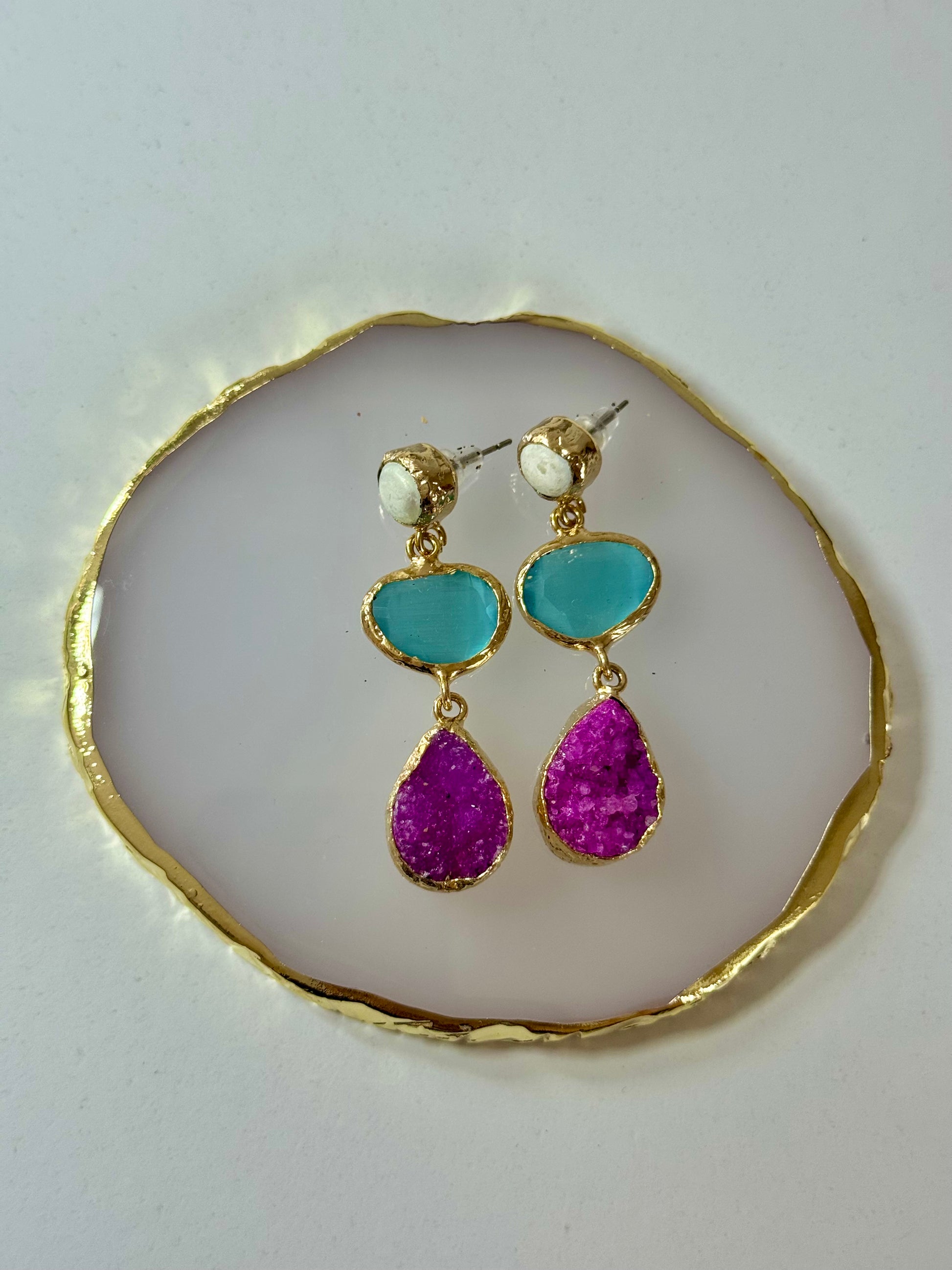 Výrazné visací náušnice, které okouzlí svou barevností. Horní část z jemně broušené tyrkysové pryskyřice je doplněna třpytivým fuchsiovým drúzovým kamenem ve tvaru kapky. Elegantní zlaté lemování a perleťový detail dodávají šperku osobitost a šarm.