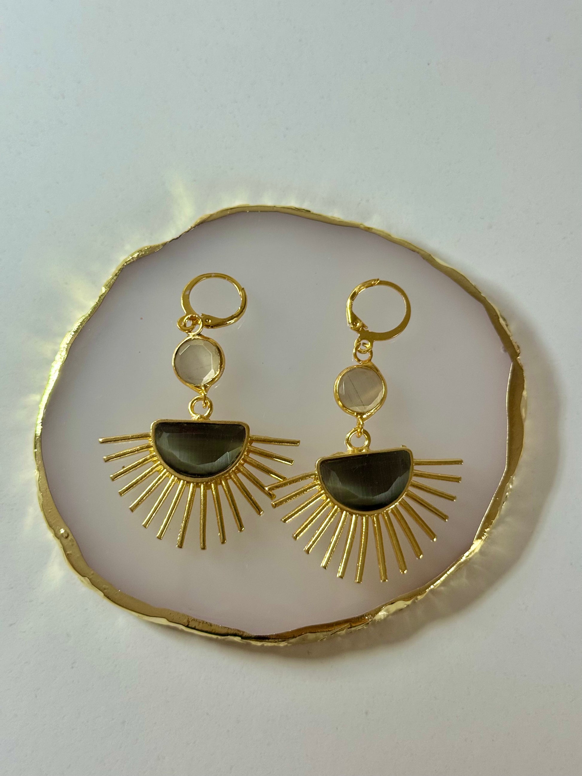 Minimalistické a výrazné zároveň – náušnice ve tvaru slunce v elegantní kouřově šedé barvě jsou ideálním doplňkem pro každý den i večerní událost. Poloprůhledná pryskyřice ve studeném odstínu kontrastuje se zlatými paprsky, které jim dodávají jas a styl.
