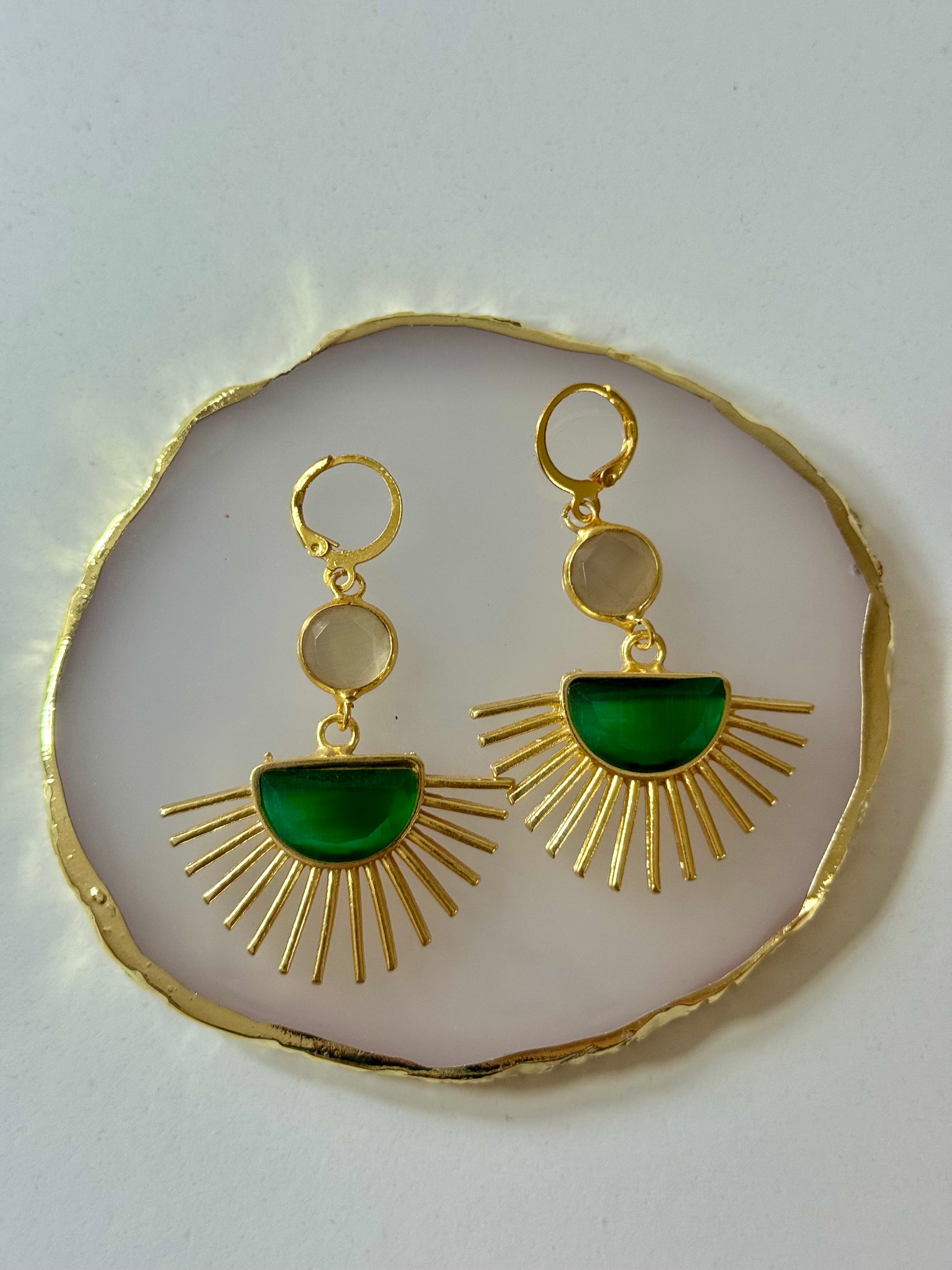 Originální náušnice inspirované slunečními paprsky kombinují výraznou zelenou pryskyřici ve tvaru půlkruhu se zlatými paprsky, které působí jako zářící slunce. Elegantní kruhové zapínání a decentní čirý detail uprostřed vytváří šperk s výraznou symbolikou a pozitivní energií.