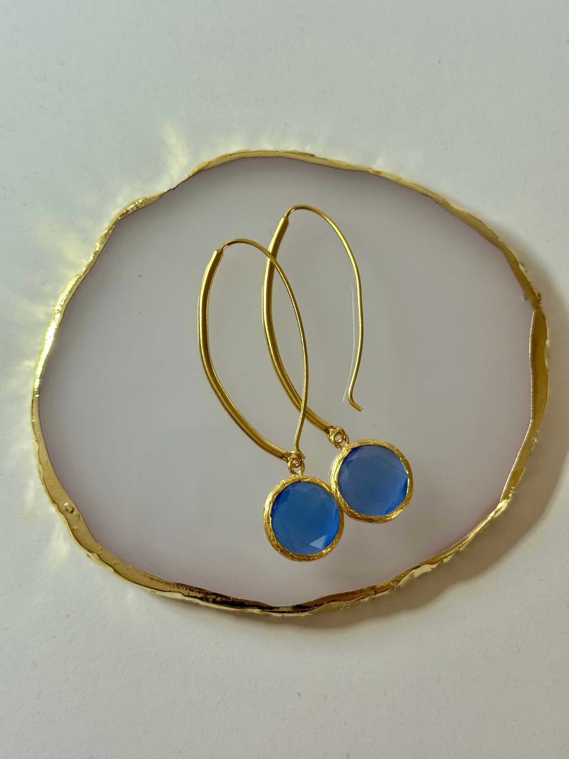Lehké a vzdušné náušnice s minimalistickým designem. Modrý broušený kámen je zasazený do jemného pozlaceného rámečku a zavěšený na elegantním dlouhém háčku. Skvělý doplněk pro ženy, které milují jednoduchost s osobitým šarmem.