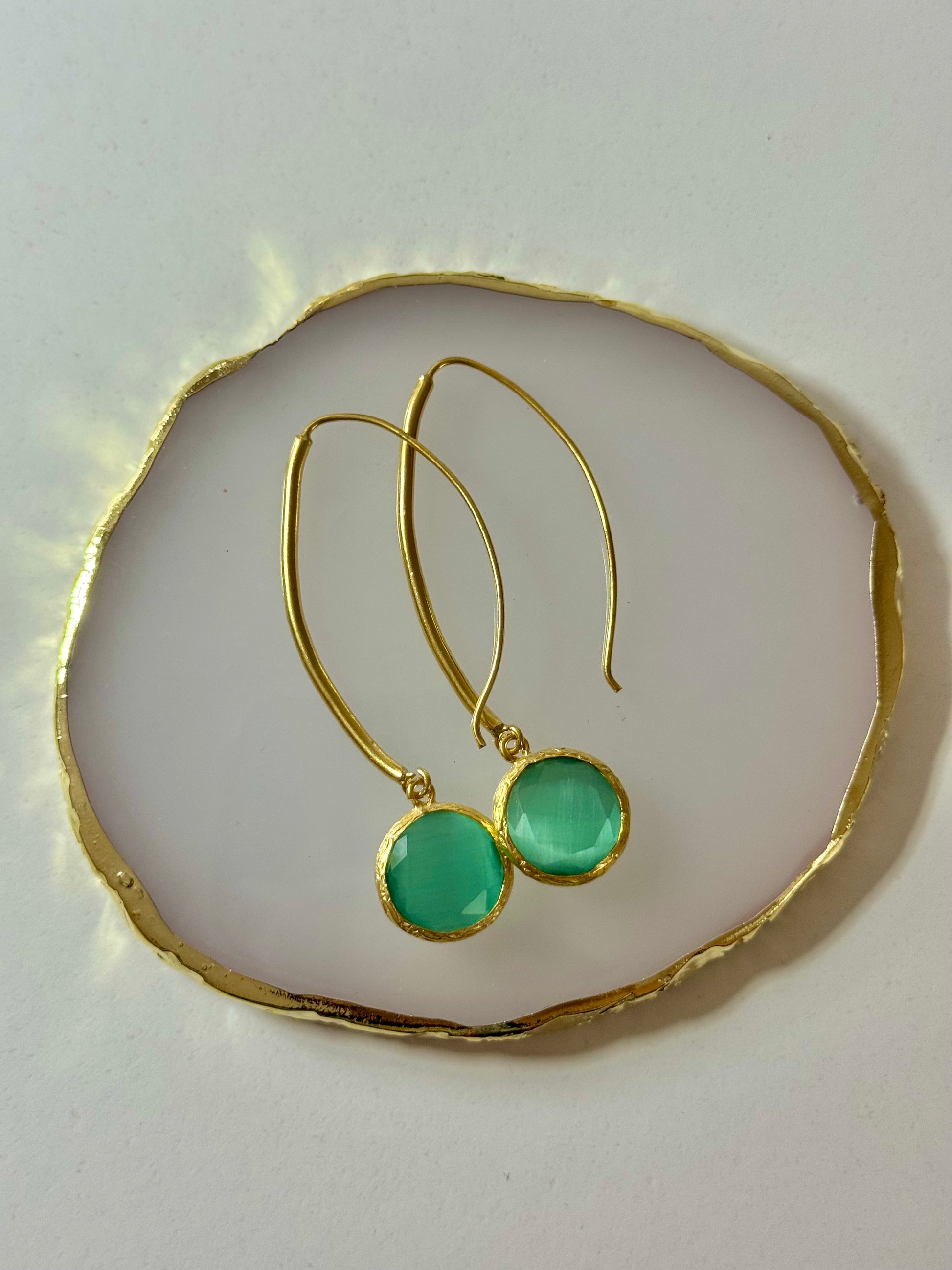 Jemné visací náušnice, které propojují eleganci a jednoduchost. Zelenkavý broušený kámen je zasazen do zlatého rámečku a zavěšen na elegantním dlouhém háčku. Ideální pro každodenní nošení i jemné slavnostní kombinace.