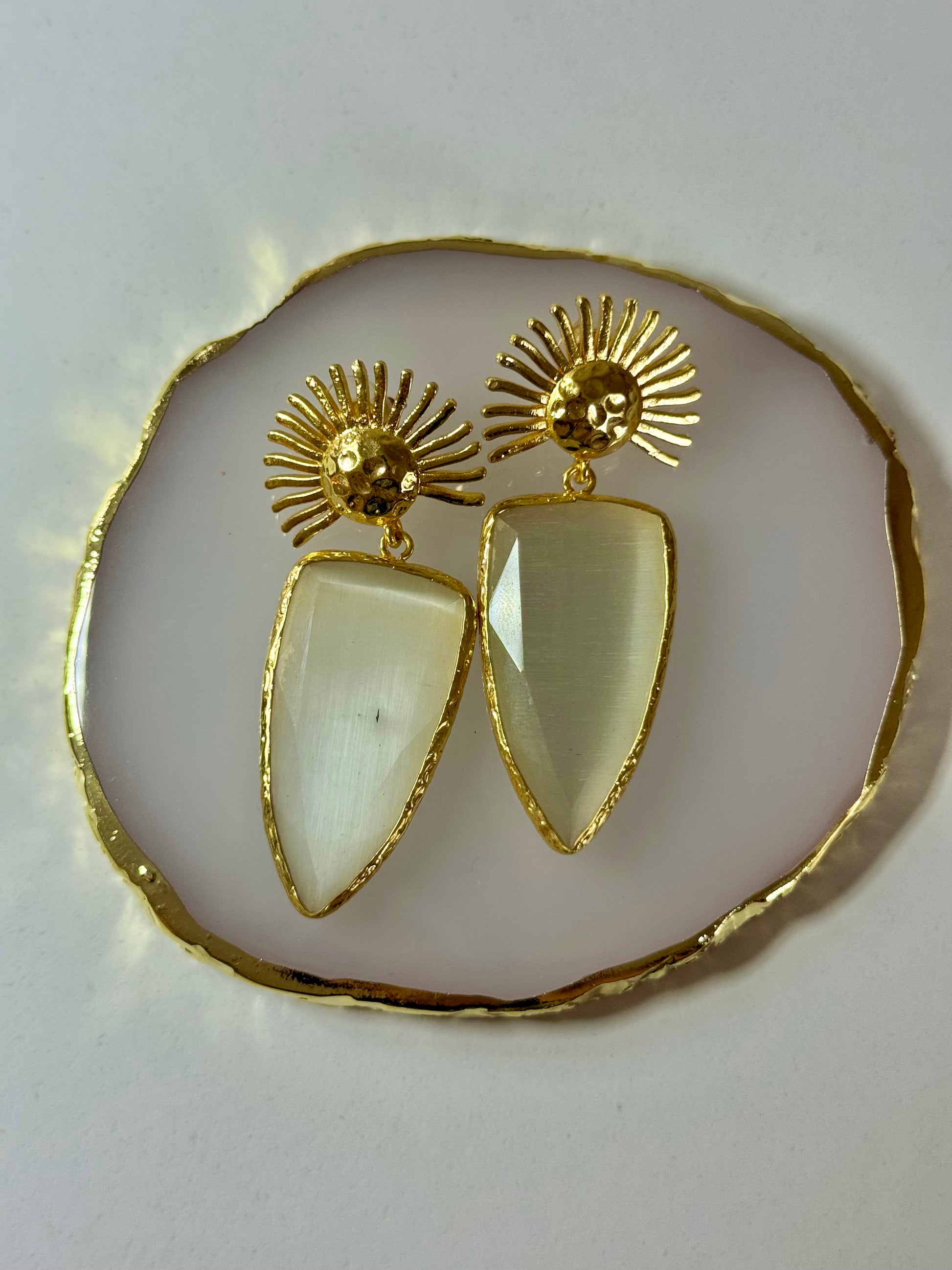 Náušnice, které v sobě nesou sílu i eleganci. Horní část tvoří zlatý sluneční motiv se strukturovaným středem a paprsky, spodní pak broušený kámen v jemně perleťovém odstínu, zasazený do pozlaceného rámečku. Výrazný a přitom vzdušný design dodává náušnicím sílu slunce i něhu světla.