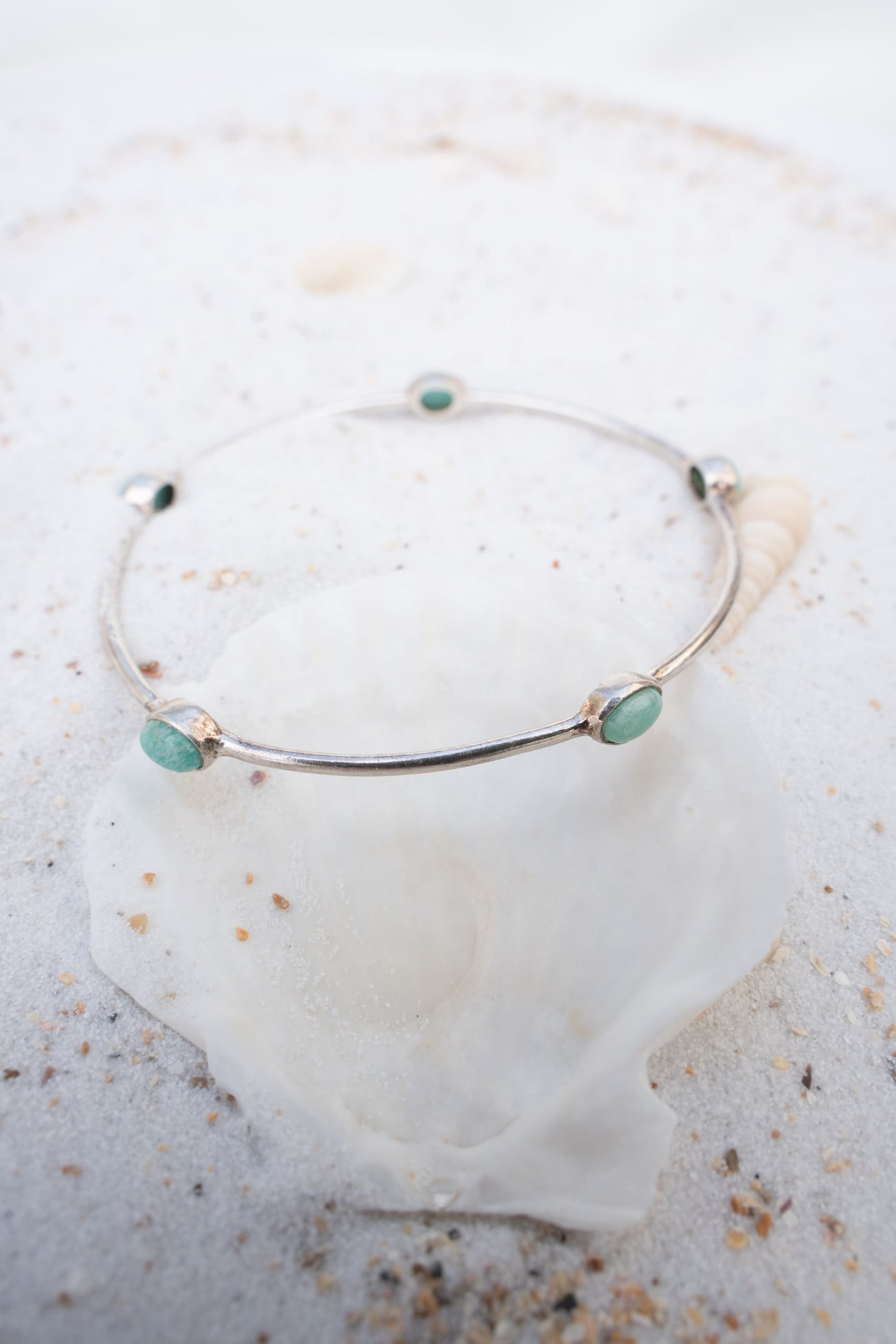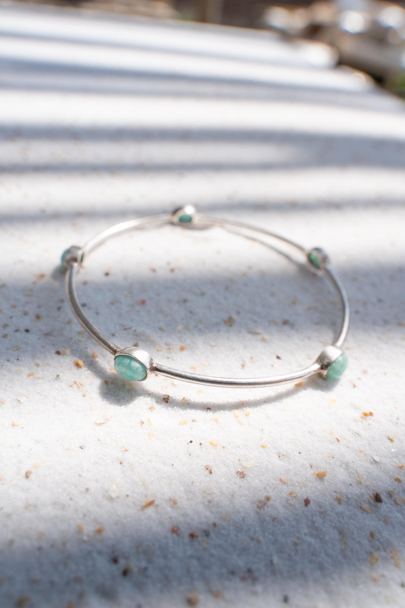 zdobený drobnými amazonitovými kamennými tečkami v tyrkysové barvě, které dodávají šperku půvabnou hru jemných odlesků,