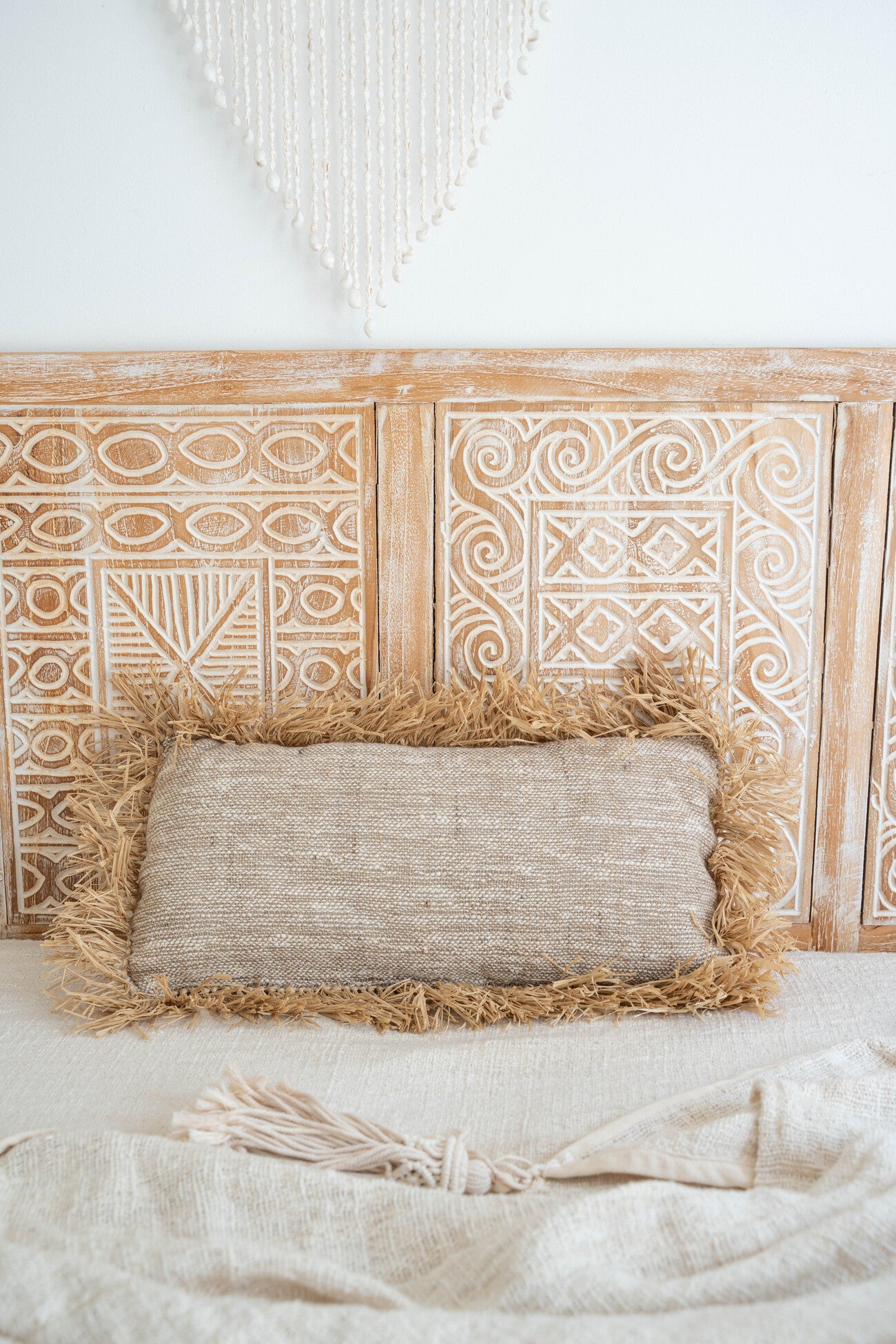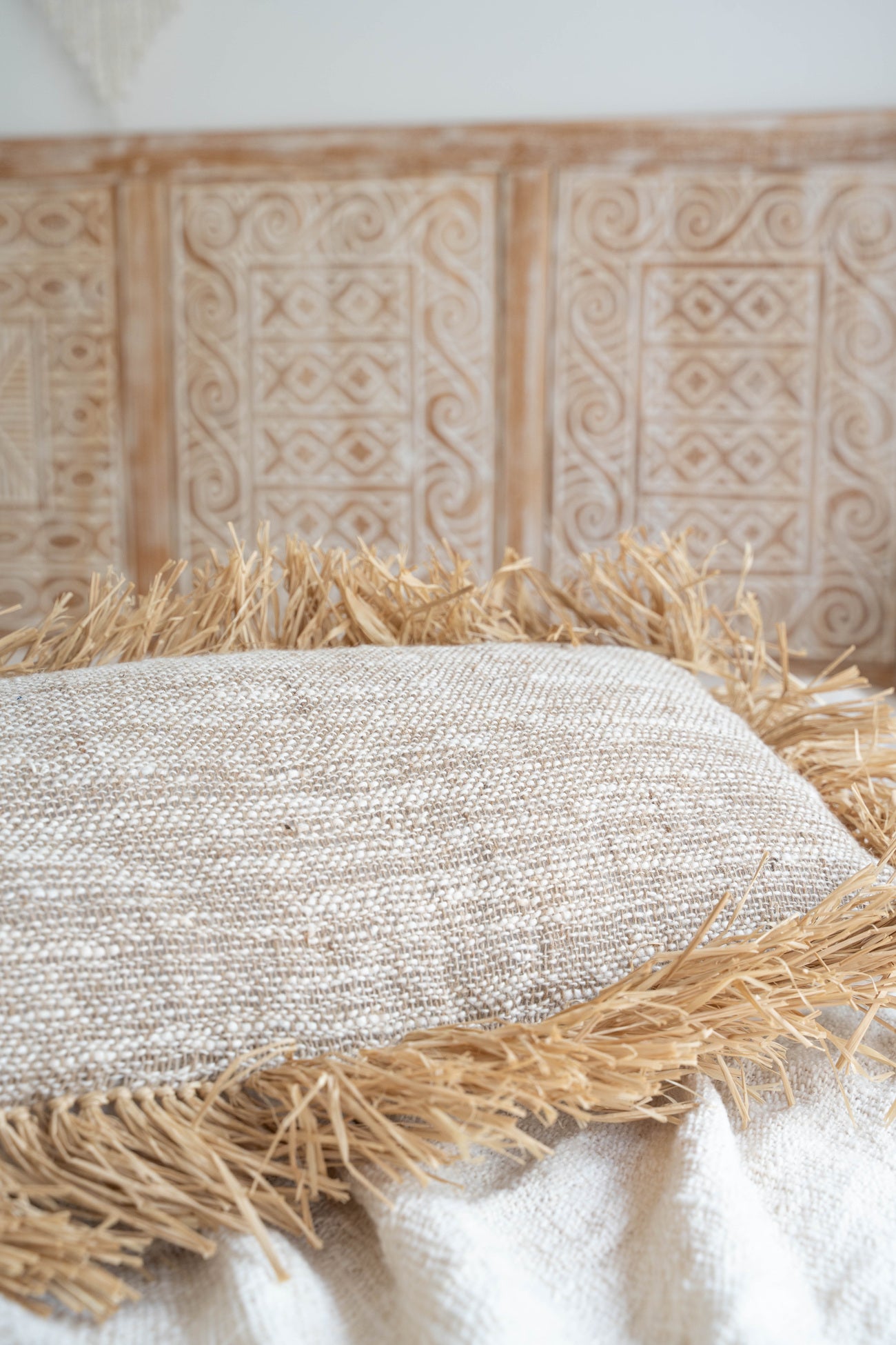 Krásný, útulný polštář zdobený střapci z rafie. Na zadní straně je skrytý zip. Dodáváme včetně polštářové výplně. Materiál bavlna + rafia.