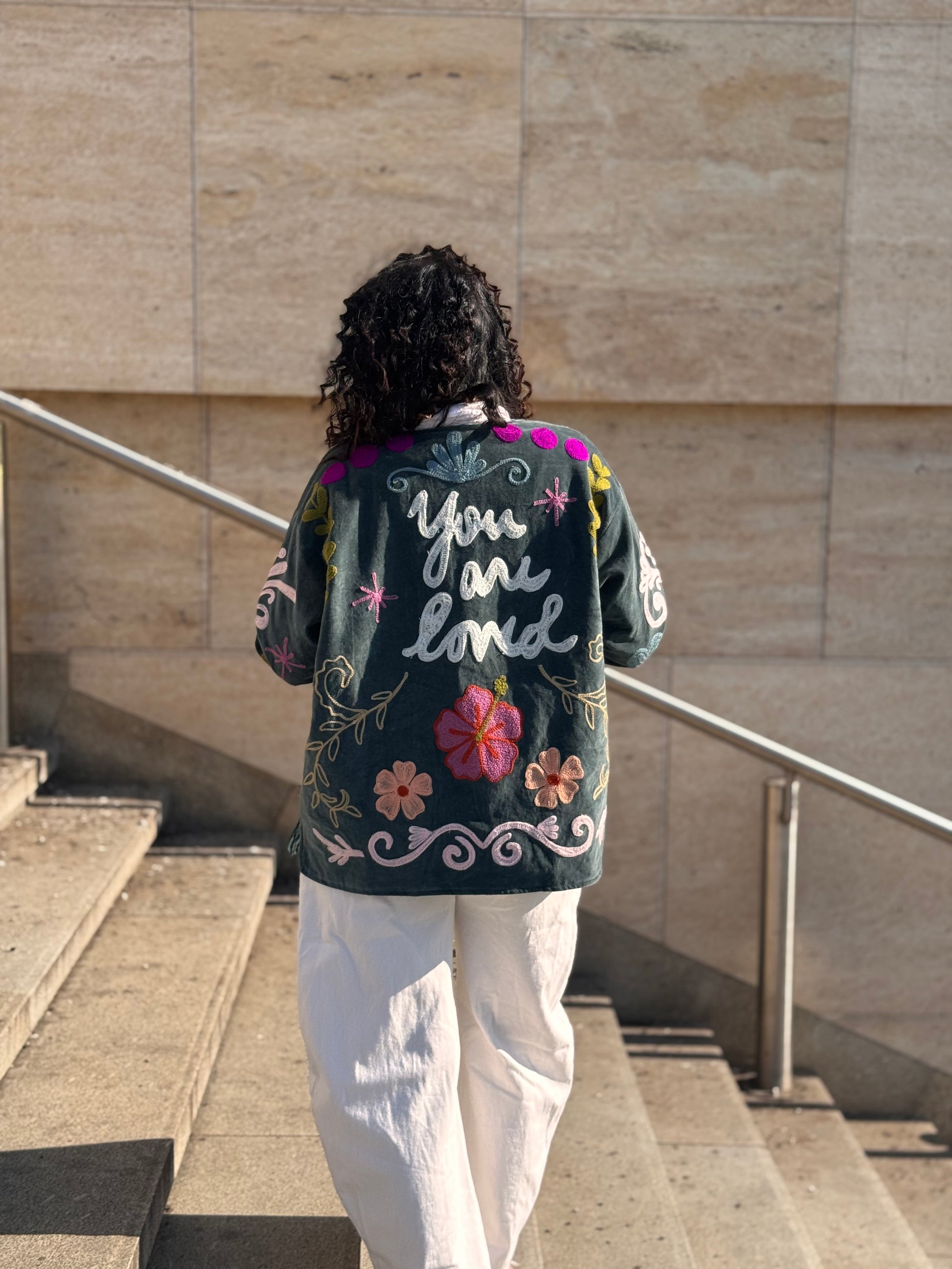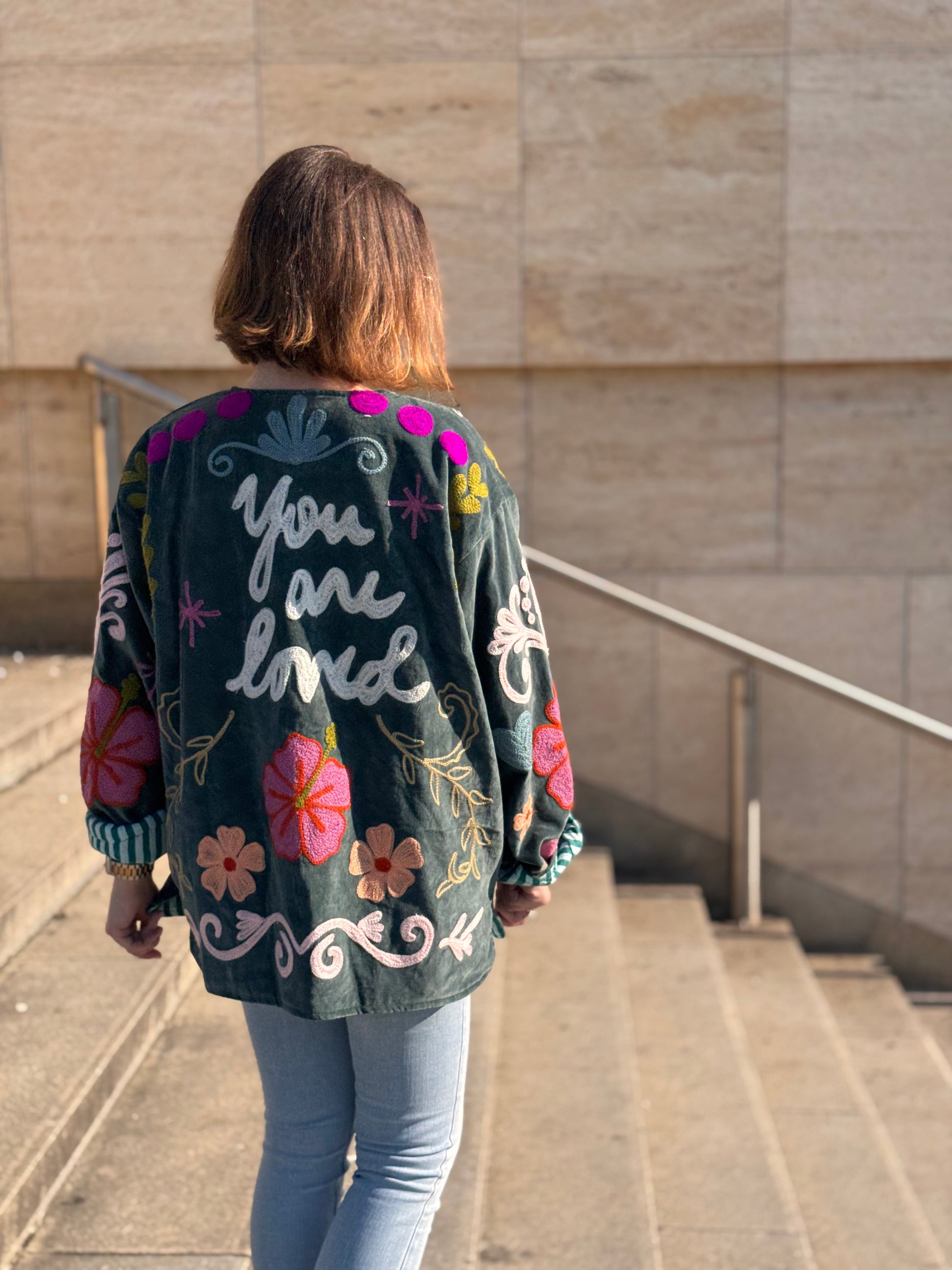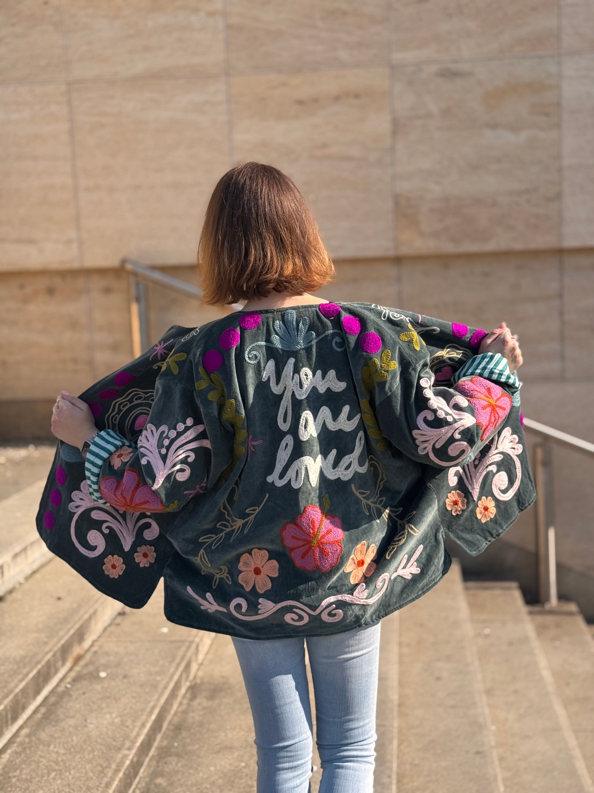 Sametová bunda Suzanni Velvet Blue – You Are Loved 🩵 je opravdu výjimečný kousek, který přitáhne pozornost na první pohled. Bohaté barevné výšivky a nápis “You Are Loved” na zádech jí dodávají hravý a pozitivní vibe. Je to bunda, která nejen krásně vypadá, ale zároveň nese milé poselství.