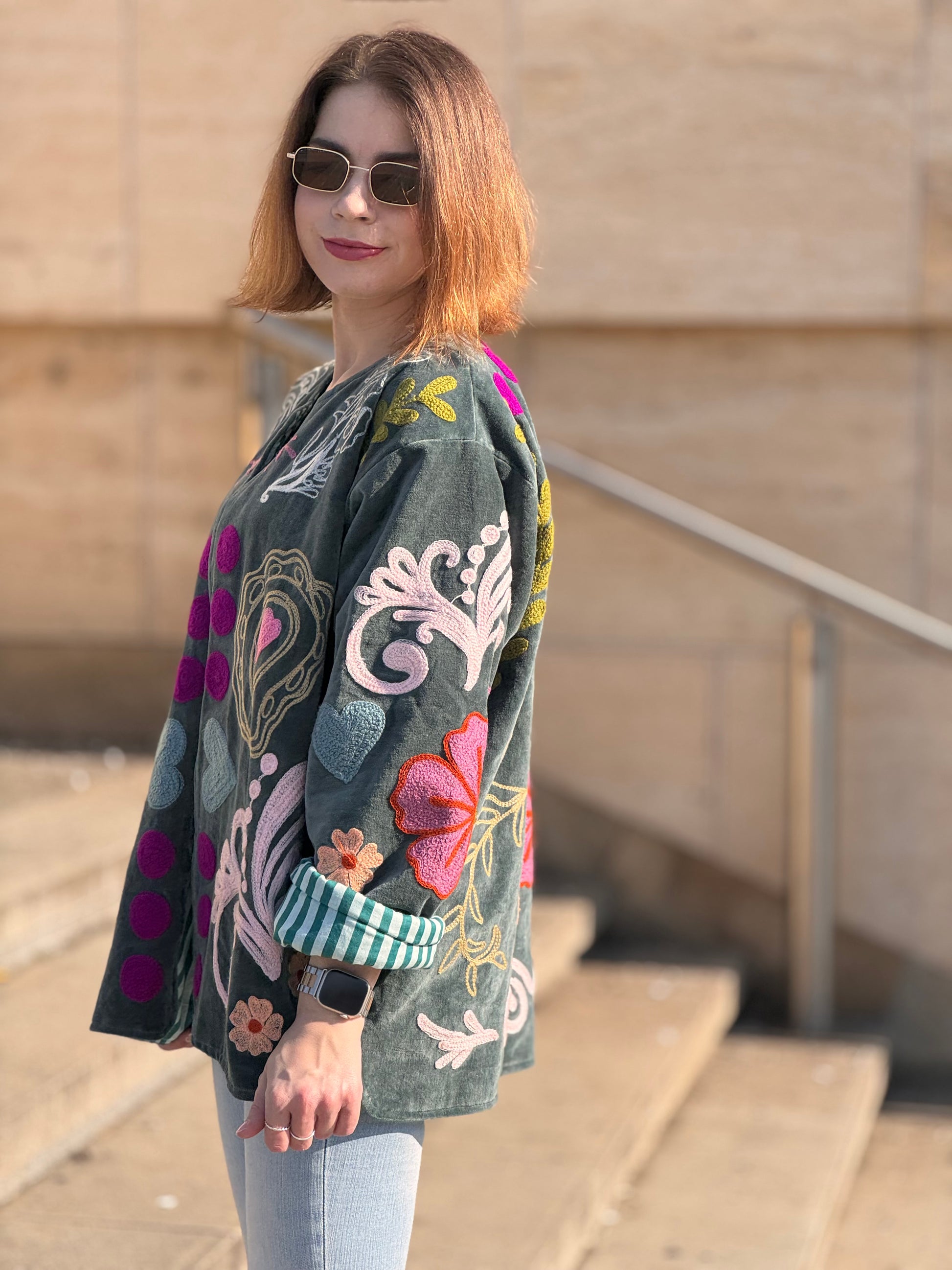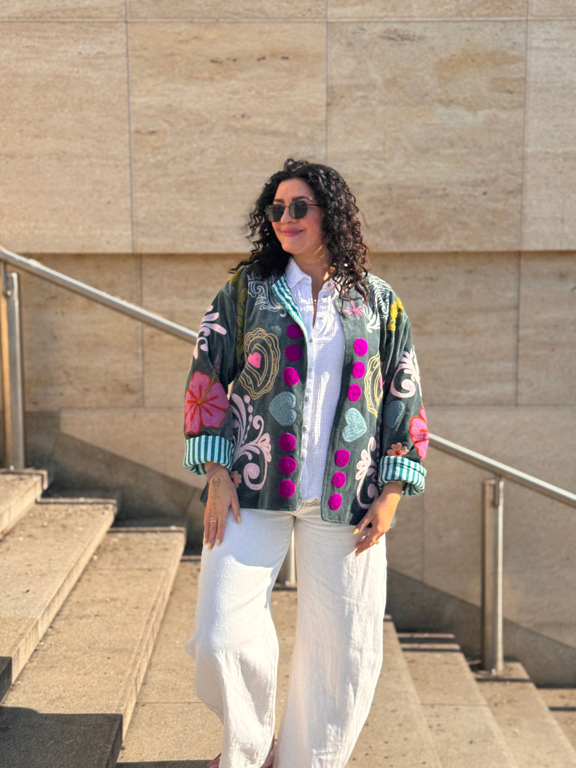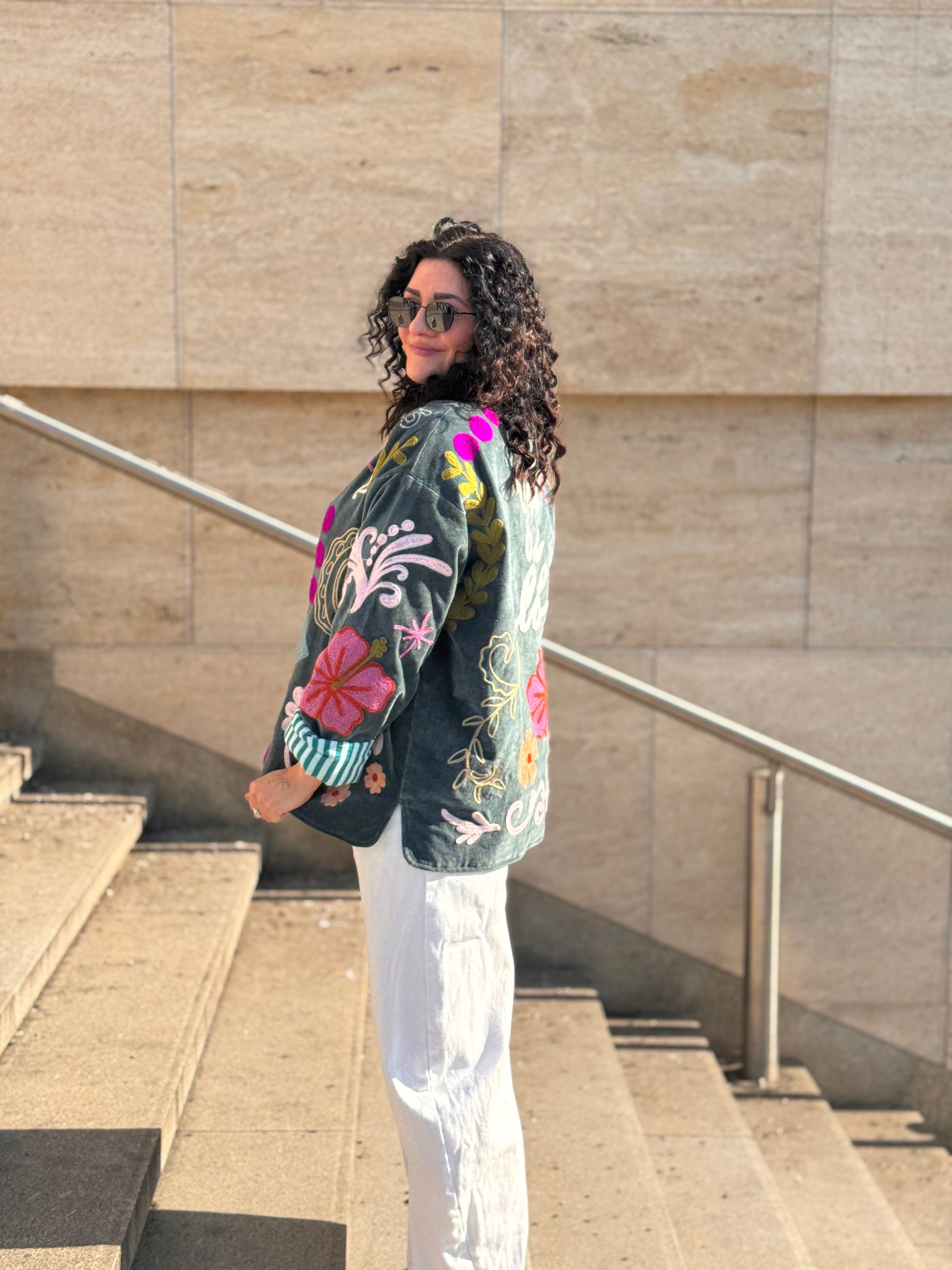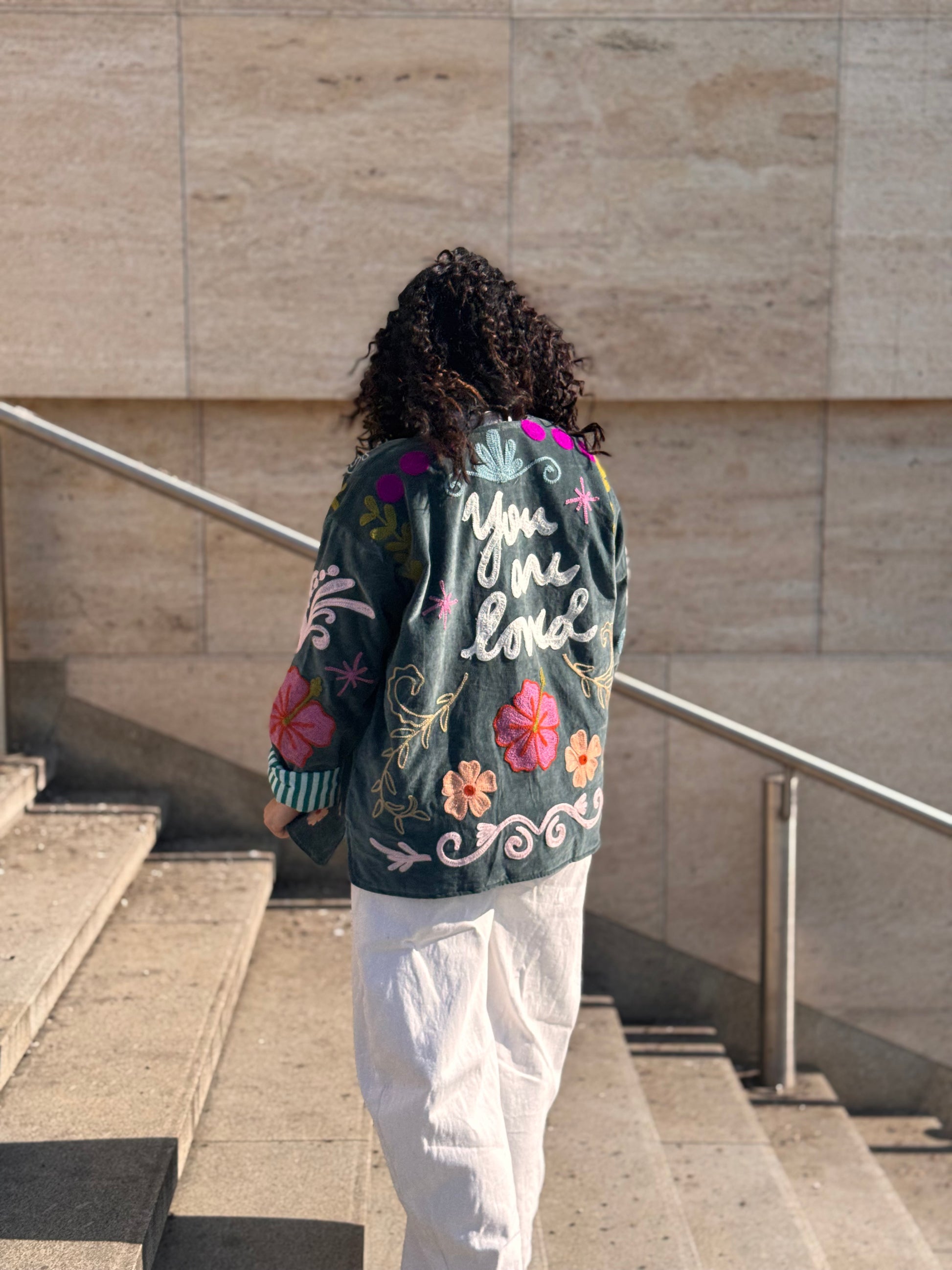 Sametová bunda Suzanni Velvet Blue – You Are Loved 🩵 je opravdu výjimečný kousek, který přitáhne pozornost na první pohled. Bohaté barevné výšivky a nápis “You Are Loved” na zádech jí dodávají hravý a pozitivní vibe. Je to bunda, která nejen krásně vypadá, ale zároveň nese milé poselství.