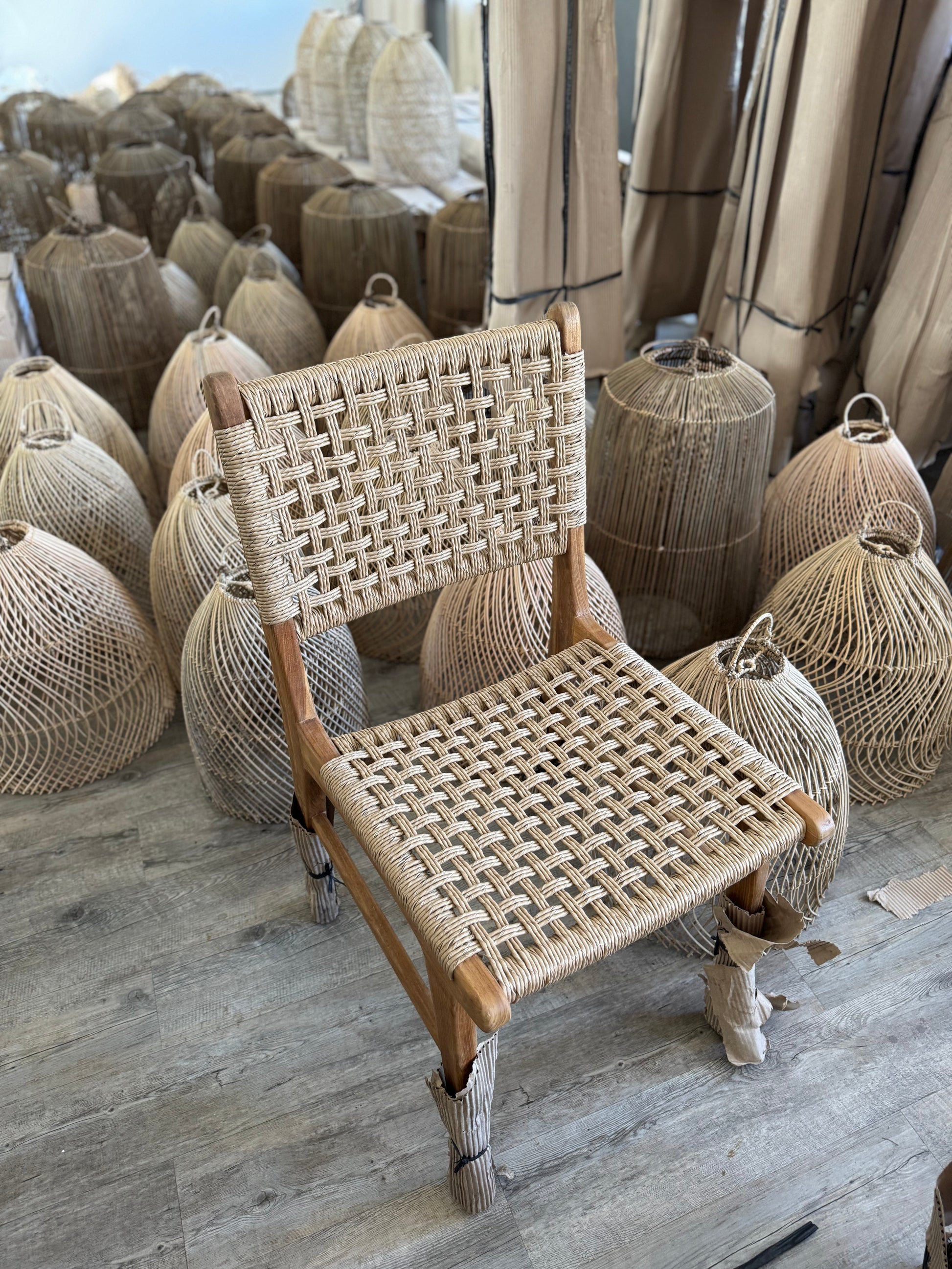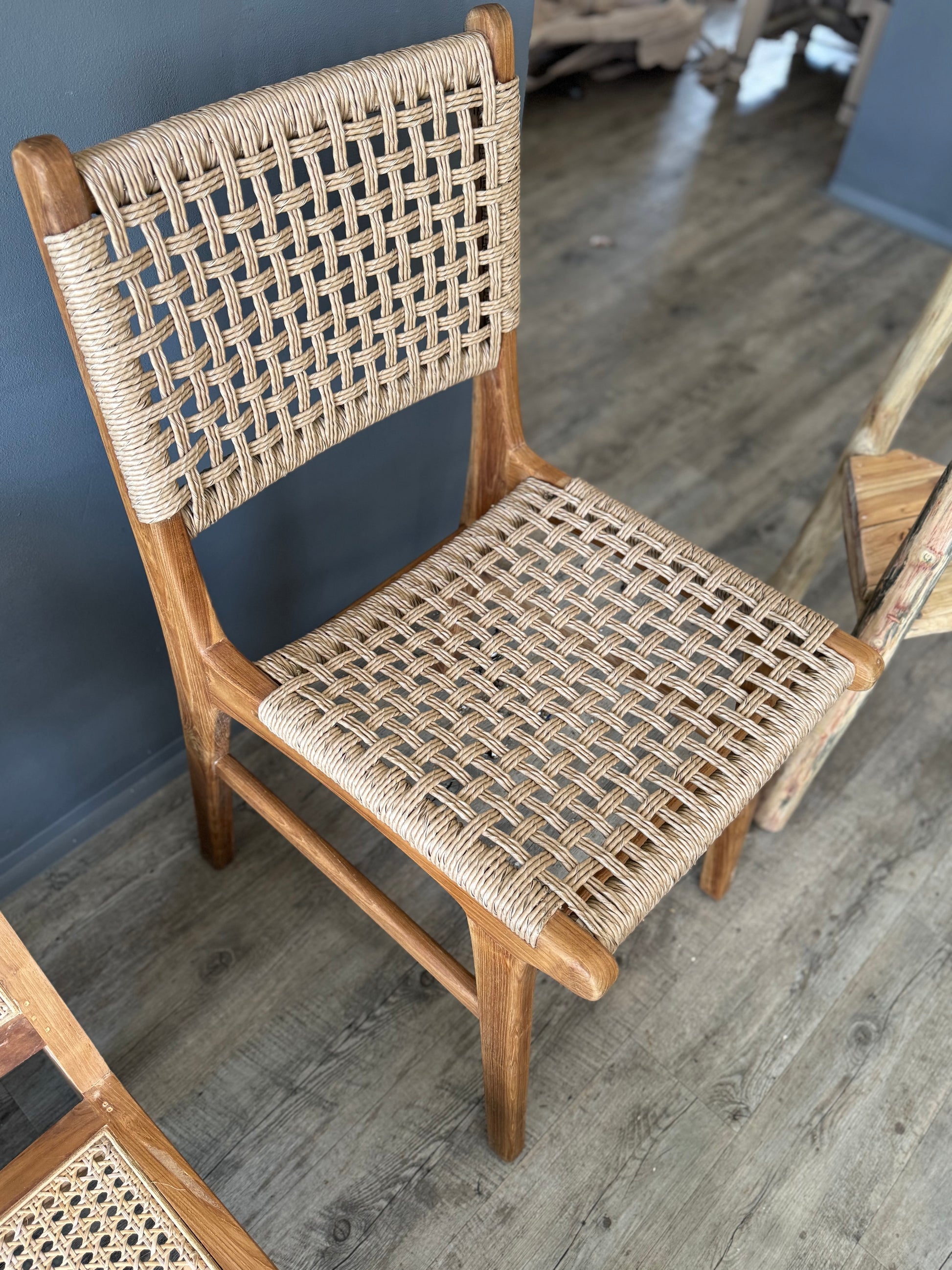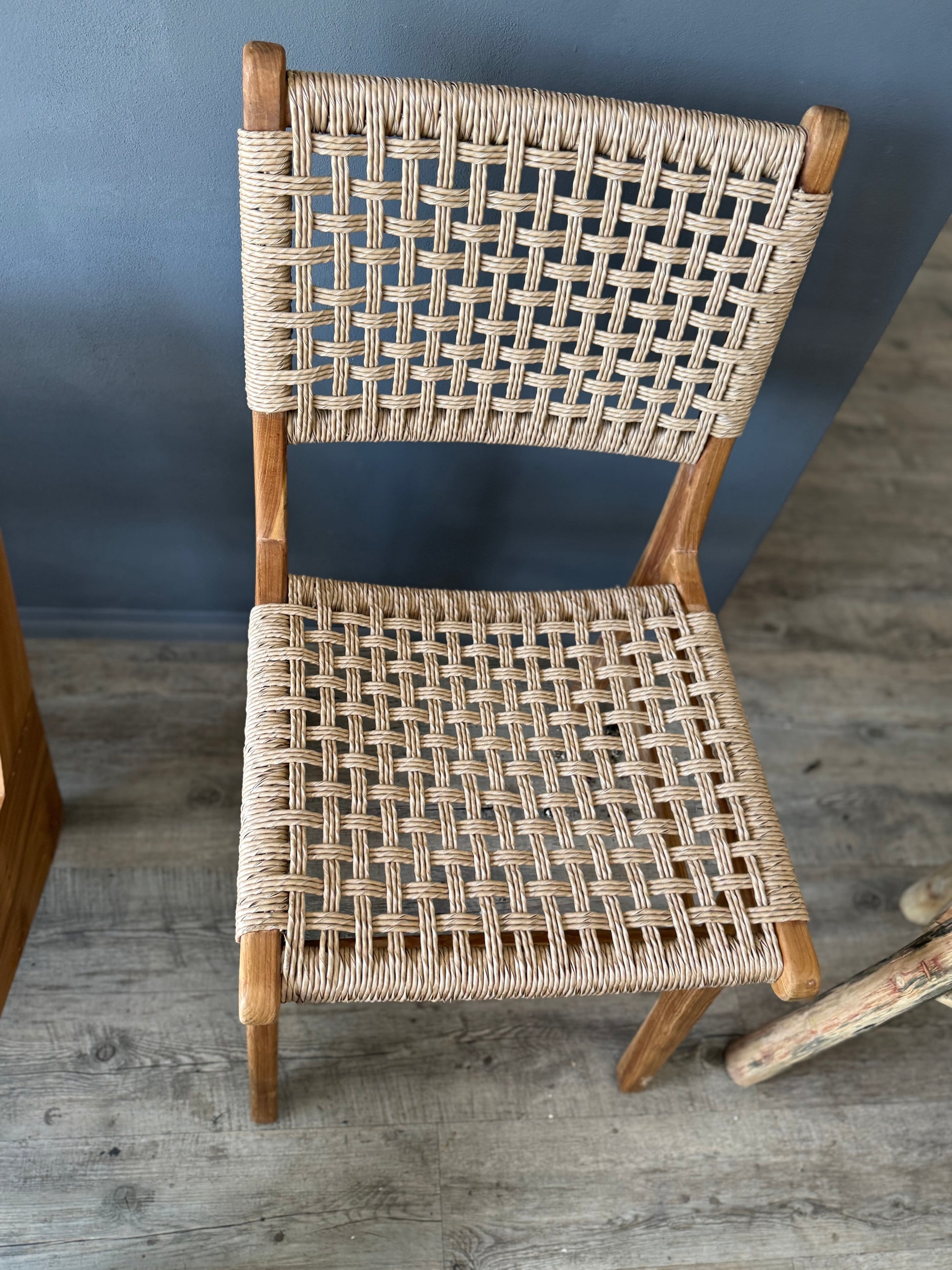 Tato elegantní jídelní židle je vyrobena z kvalitního masivního teakového dřeva a doplněna pevně pleteným sedákem i opěrkou z odolného syntetického výpletu ve vzhledu přírodního ratanu. Díky tomu je vhodná jak do interiéru, tak pro venkovní použití – skvěle odolává dešti i slunečnímu záření.