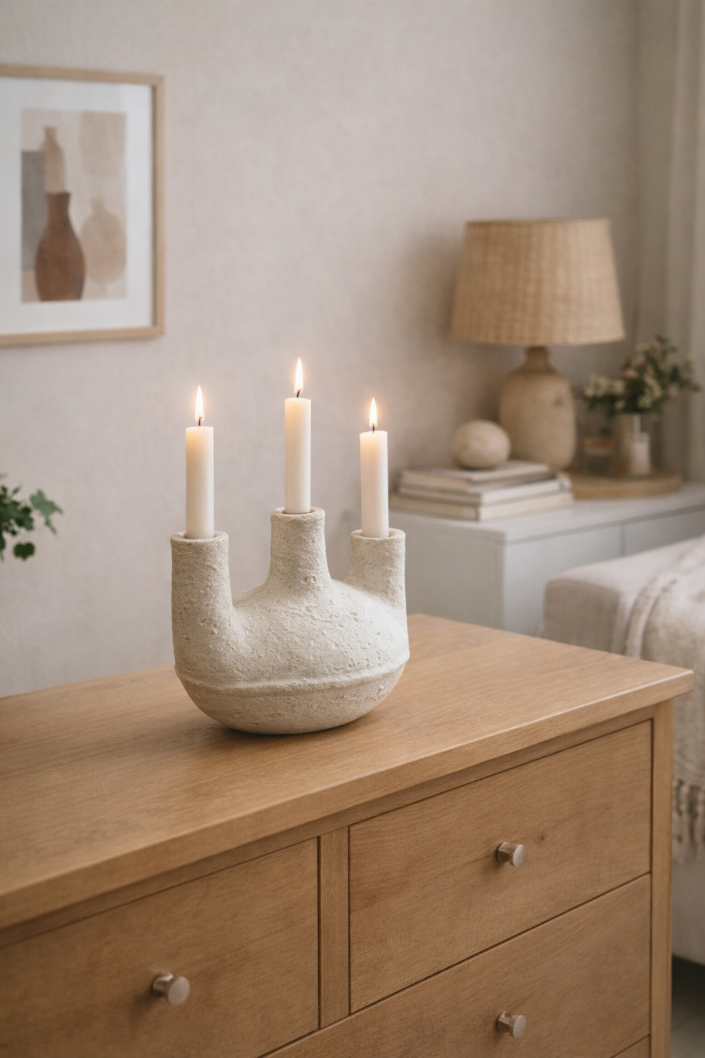 Originální keramická váza s matným povrchem a třemi hrdly, vhodná pro sušené i čerstvé květiny nebo jako samostatný dekorativní prvek. Jednoduchý a elegantní design se hodí do moderních i rustikálních interiérů.