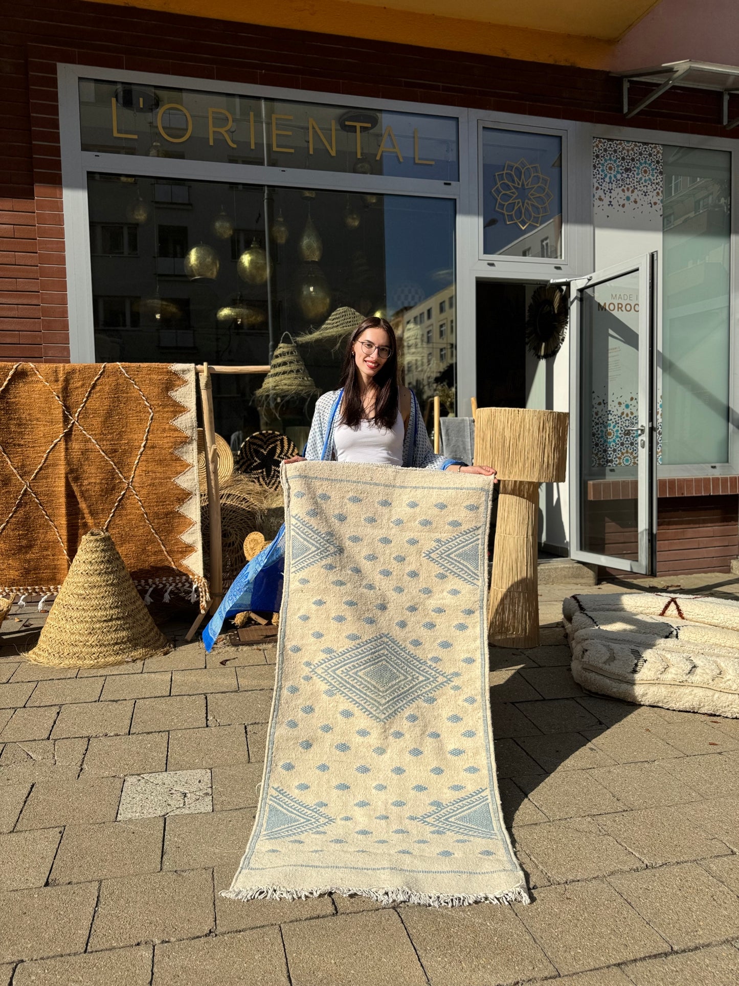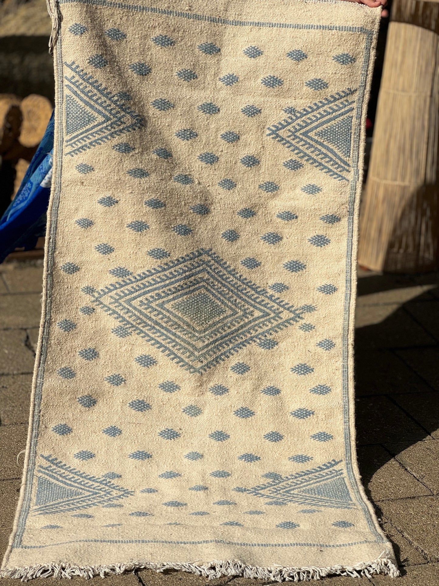 Ručně tkaný kobereček z přírodní vlny v jemně krémovém odstínu s decentním modrým vzorem. Skvěle se hodí do předsíně, ložnice nebo jako doplněk ke křeslu – kdekoliv, kde chceš trošku pohody, tepla a stylu.