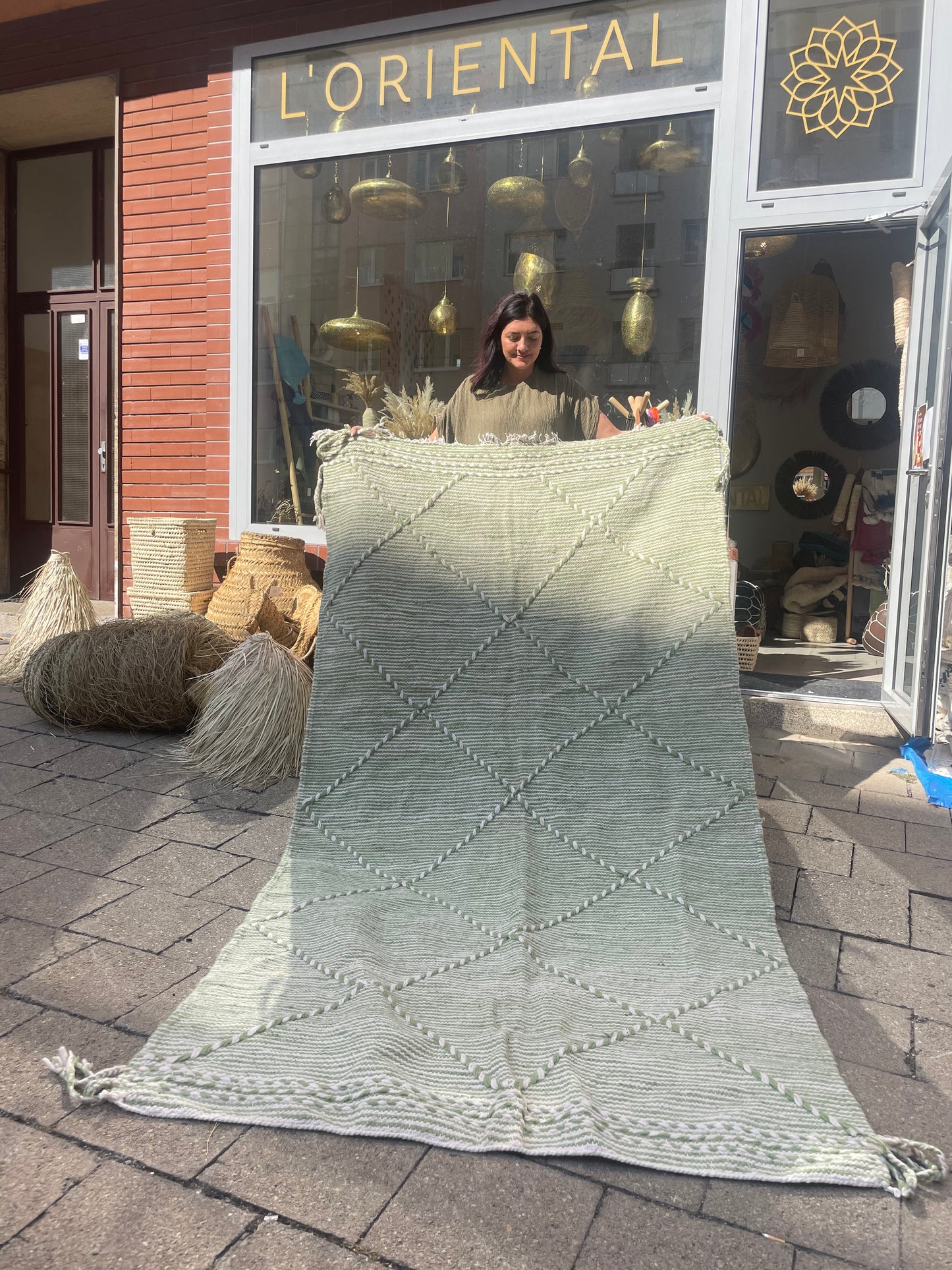 Hladce tkaný koberec z ovčí vlny s jemným geometrickým vzorem a zelenkavým odstínem, který působí jako svěží závan přírody. Ideální pro ty, kdo hledají přírodní materiál, minimalistický design a uklidňující barevnost.