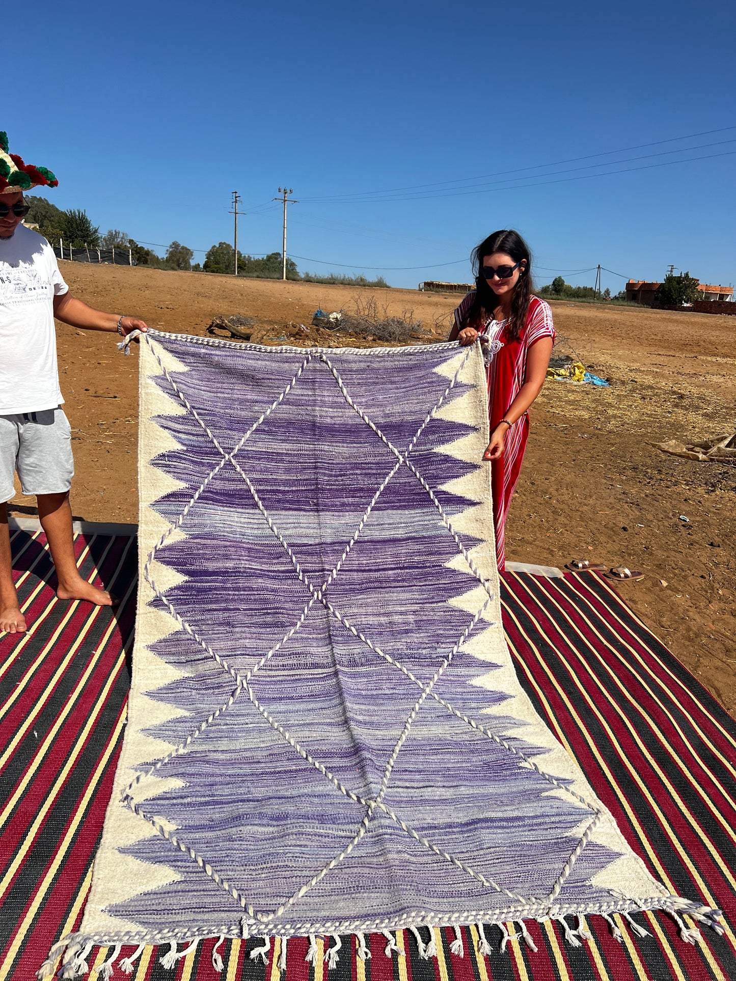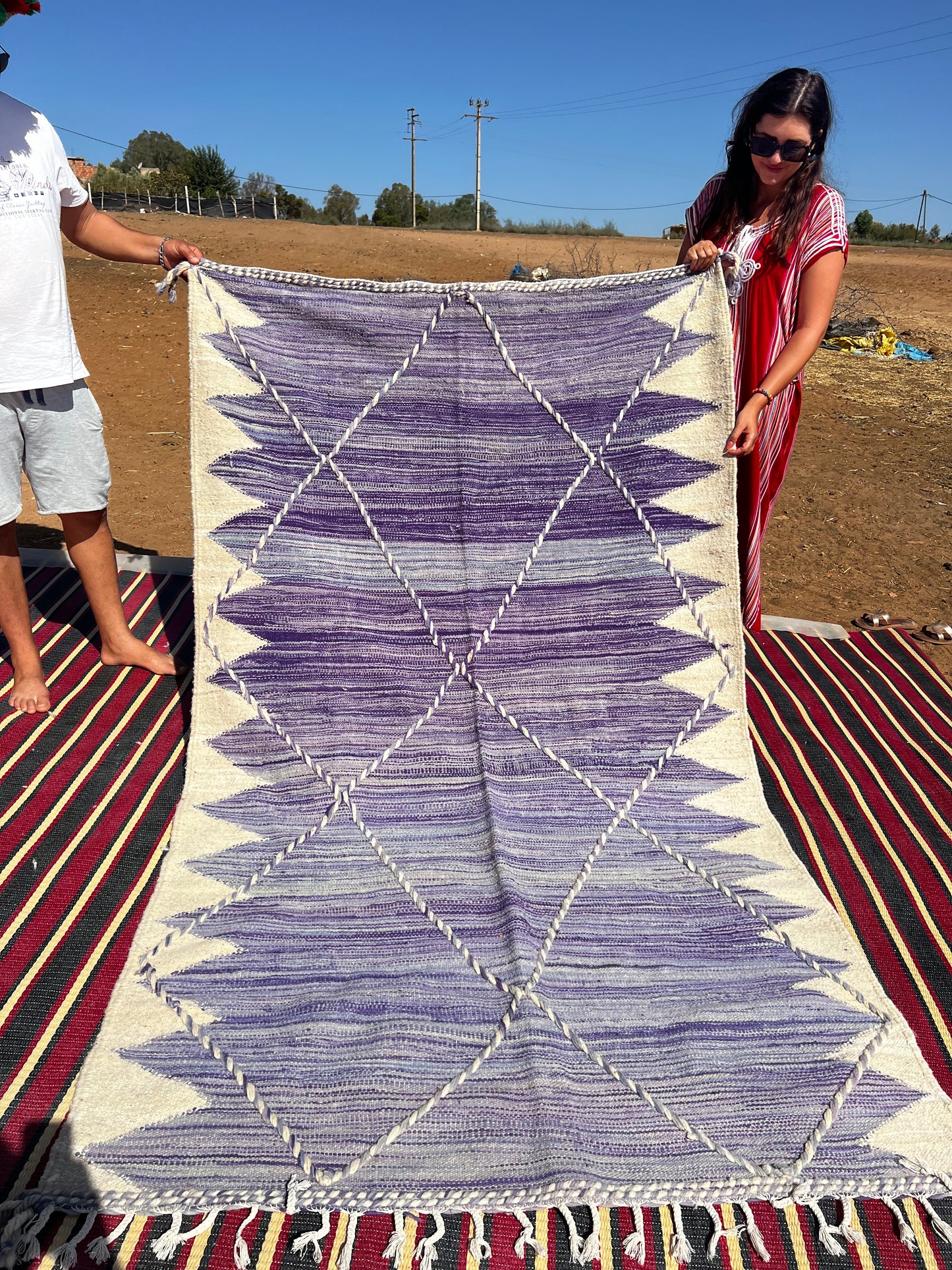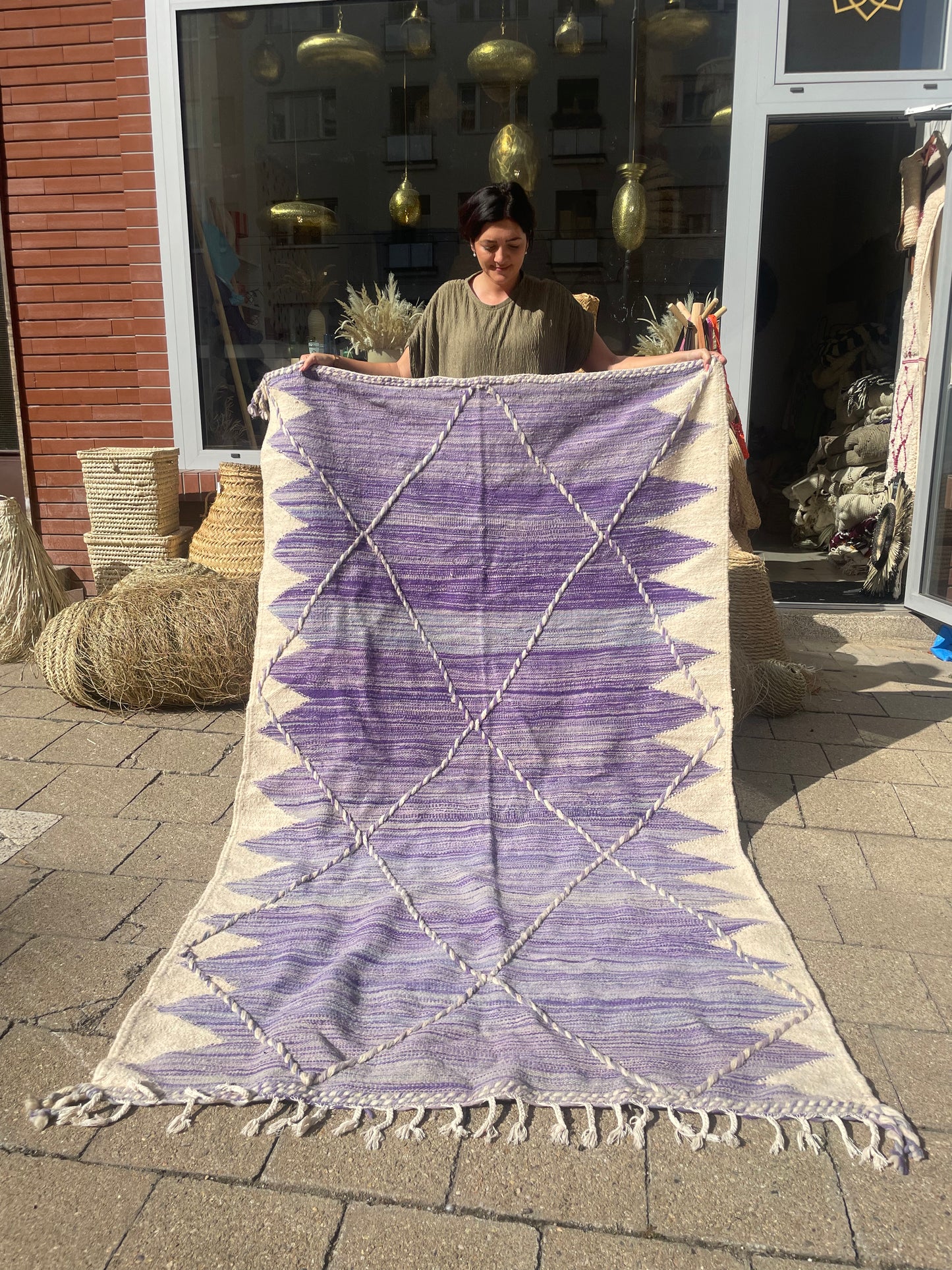 Hladce tkaný koberec z ovčí vlny s geometrickým vzorem v elegantní kombinaci fialových tónů. Minimalistický, ale nepřehlédnutelný. Ručně tkaný tradiční technikou Zanafi, která kombinuje čistotu tvaru s bohatou strukturou.