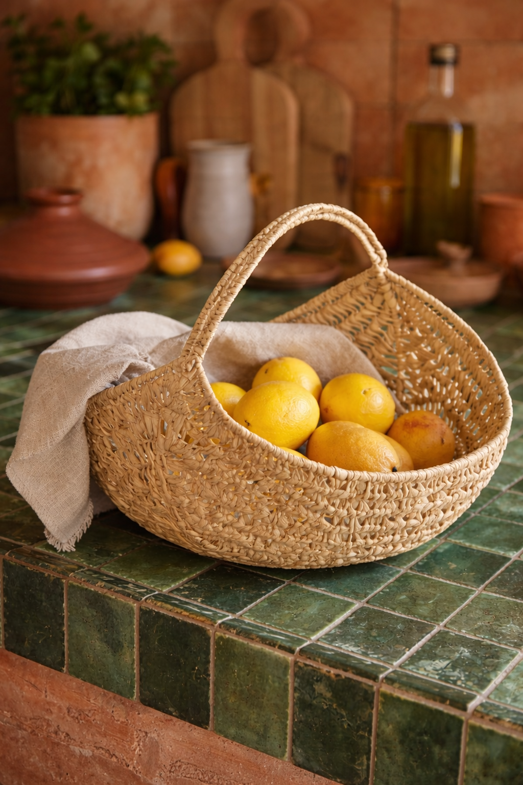 Elegantní a zároveň praktický košík, který se stane stylovým doplňkem nejen do domácnosti, ale i na cesty. Je vyroben z přírodních palmových listů a zpevněn kovovou konstrukcí, díky níž drží svůj tvar a je odolnější proti opotřebení.