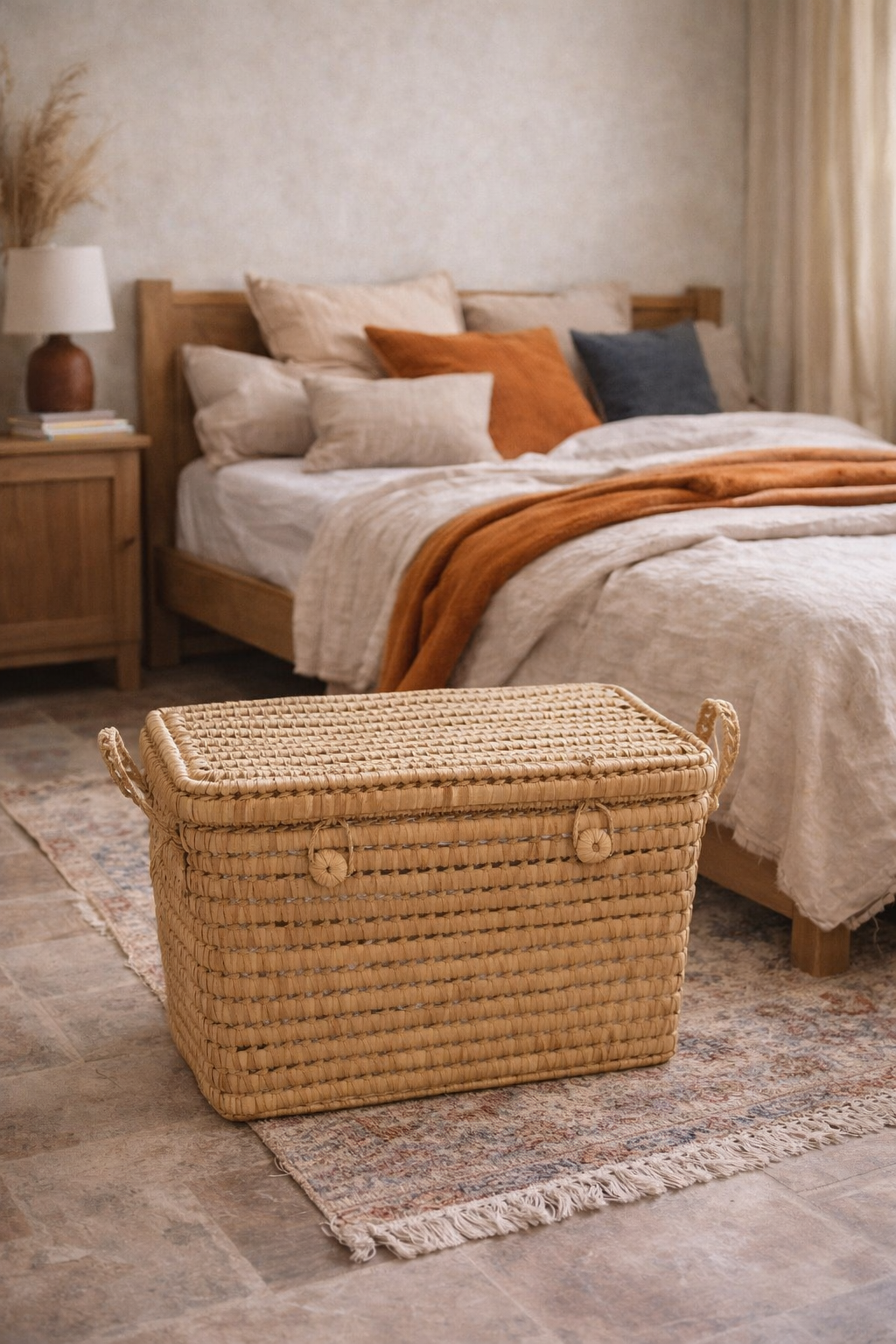 Praktický a stylový koš s víkem, který využijete jako úložný prostor i dekorativní prvek do interiéru. Uzavírání na knoflíky ochrání obsah před prachem a zároveň zachovává estetiku přírodního materiálu. Boční úchyty zajišťují snadné přenášení.