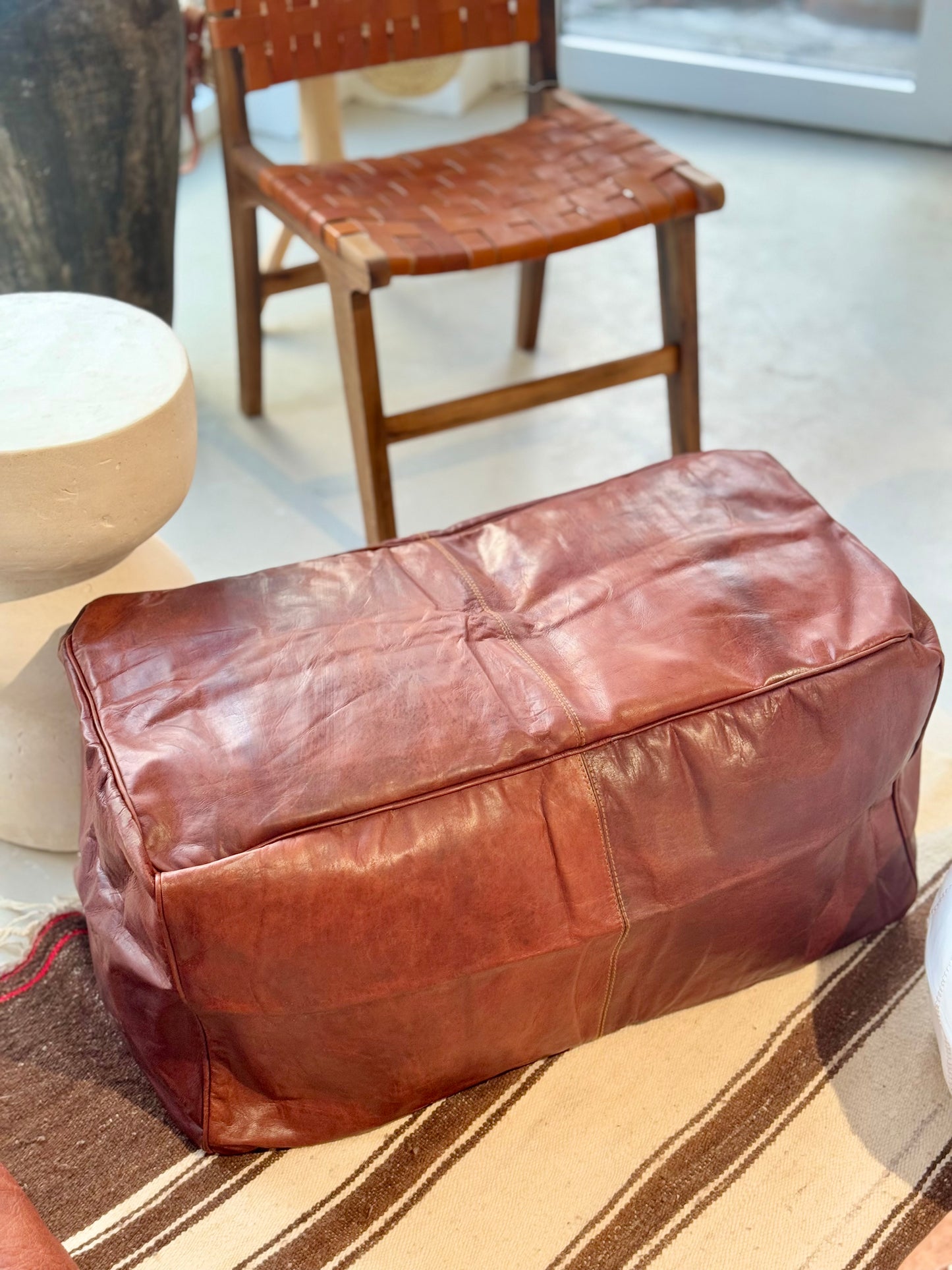 Kožený puf vyrobený z kozí kůže. Zapínání na zip na spodní straně.