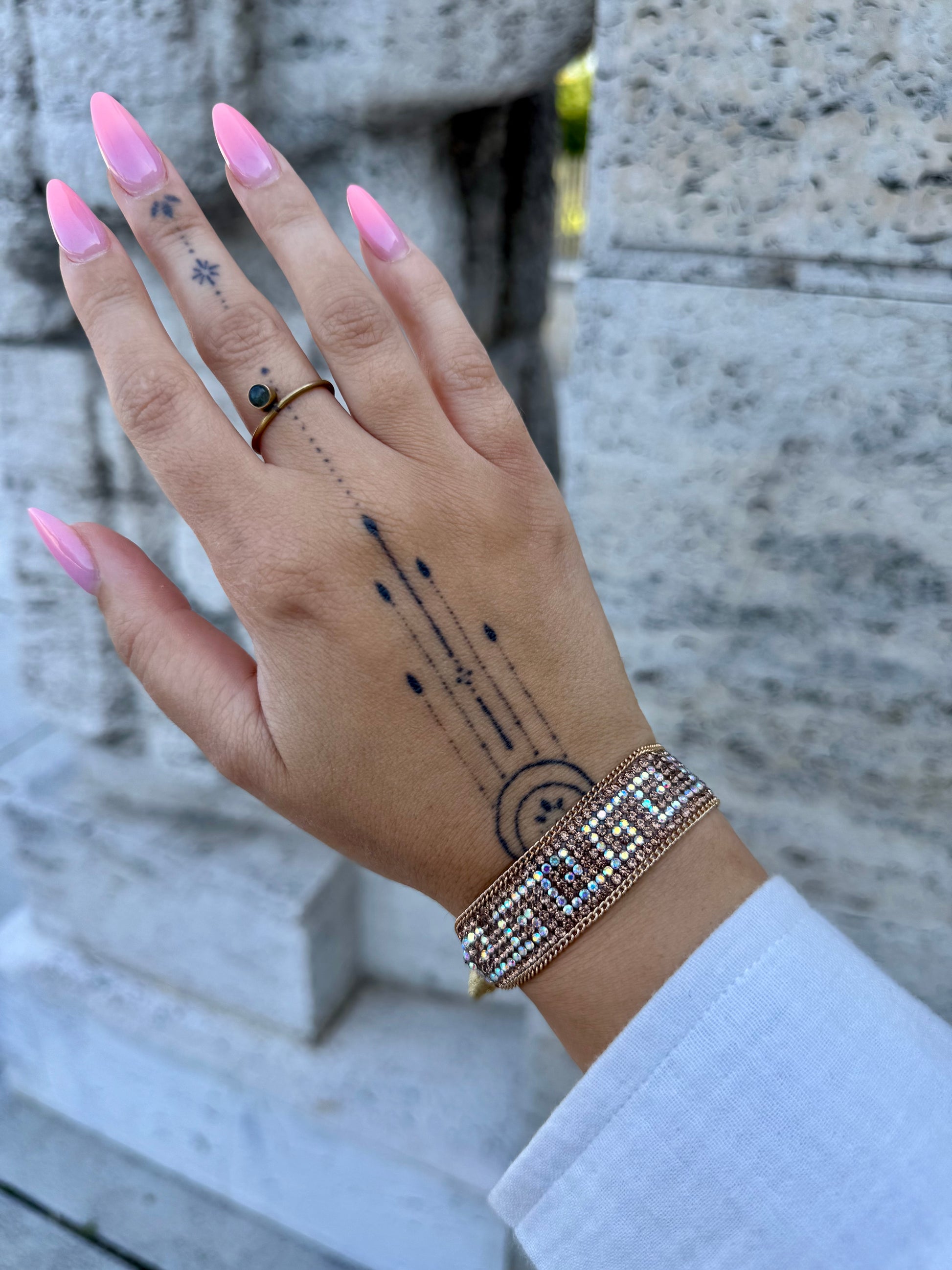 Výrazný třpytivý náramek, který kombinuje zlatavé tóny s perleťovým leskem. Díky bohatě osazeným kamínkům působí luxusně a je ideálním doplňkem na slavnostní události i večerní nošení.