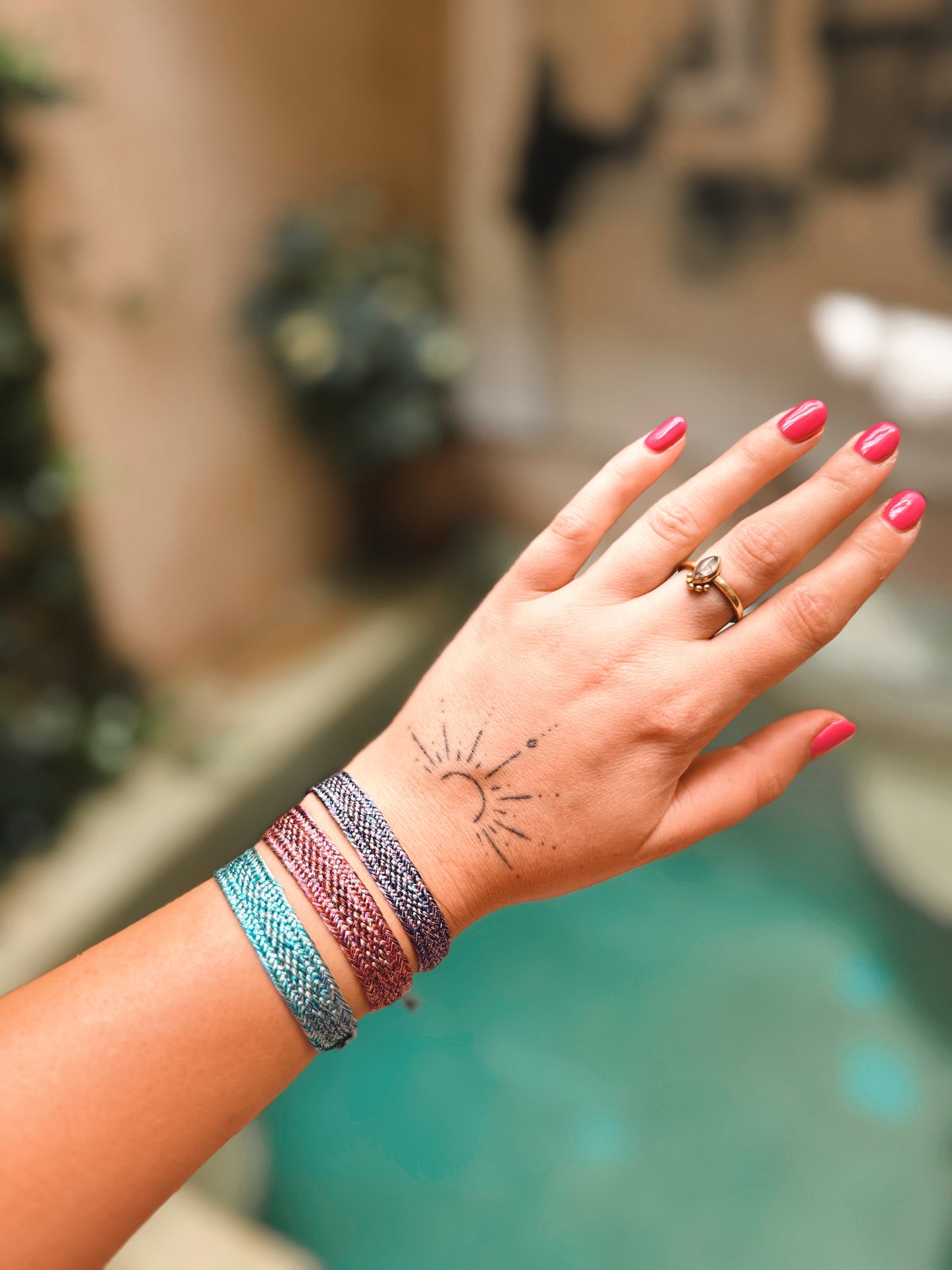 Elegantní náramek v jemných odstínech růžové, mědi a zlaté, spletený z kvalitních prýmků technikou, která vytváří bohatou strukturu a jemný lesk. Širší provedení působí výrazně, ale díky své barevnosti stále zůstává něžným doplňkem ke každodennímu nošení.