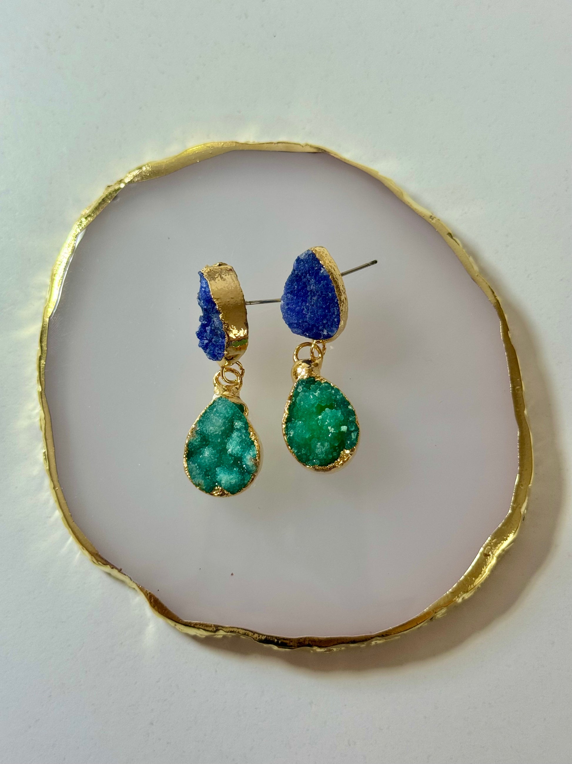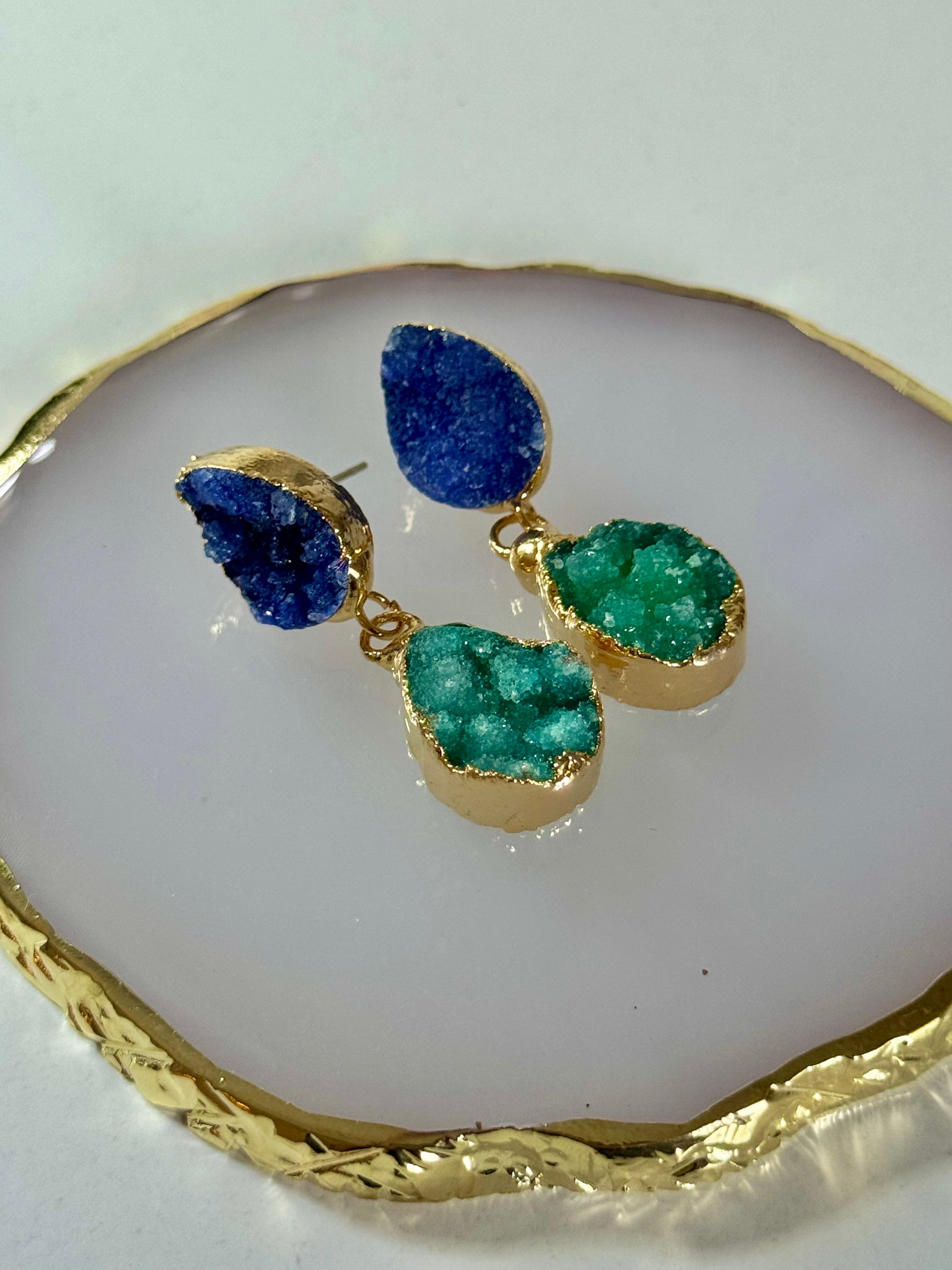 Výrazné visací náušnice s přírodními minerály typu druzy, které září v kontrastní kombinaci modré a zelené barvy. Kamínky mají surový, krystalický povrch, který každému kusu dodává jedinečný charakter. Zasazeno do luxusní pozlacené mosazi, která podtrhuje přírodní krásu minerálů.