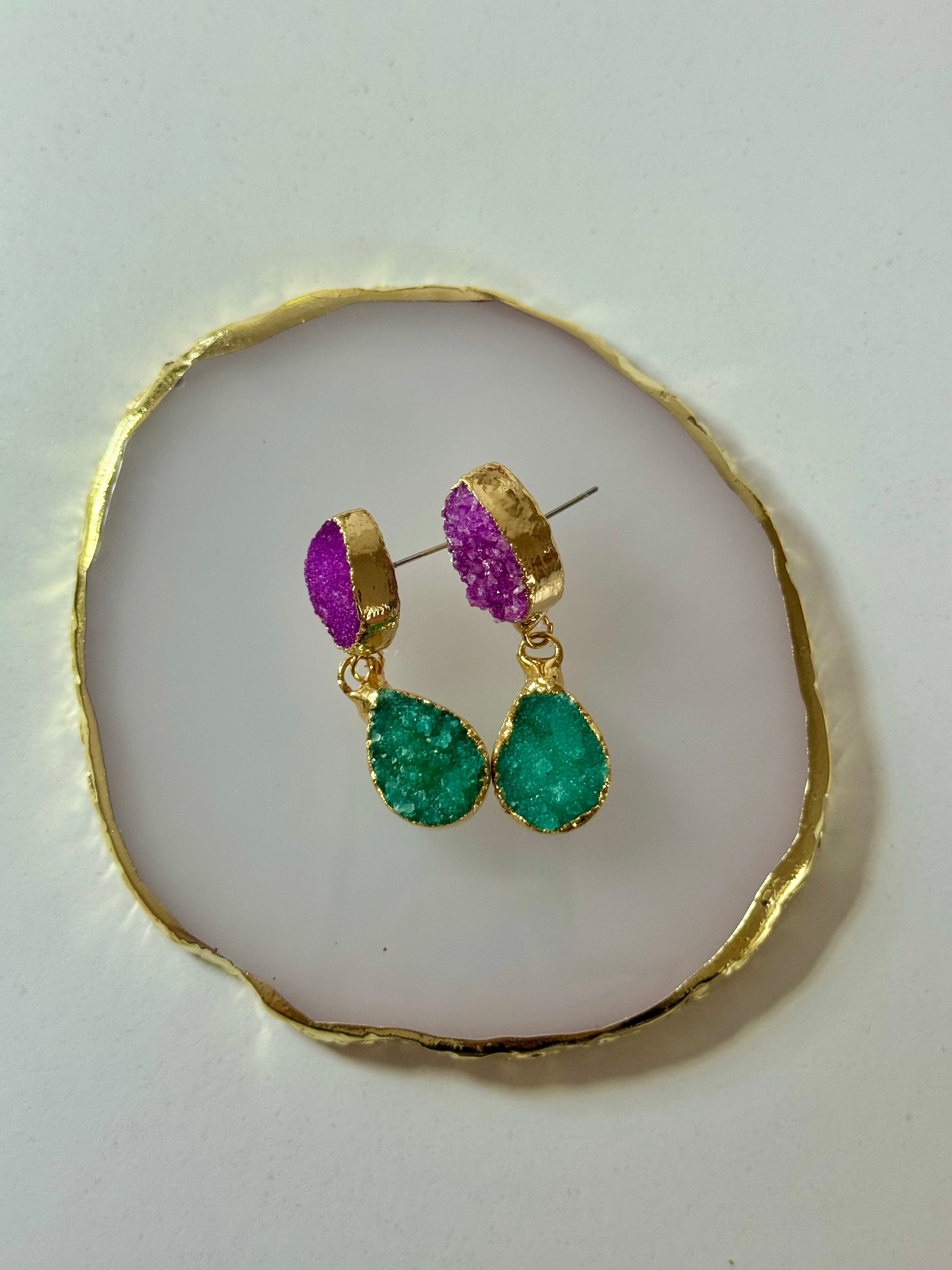 Luxusní náušnice s přírodní strukturou krystalů v zářivých barvách. Každý kus je originál díky jedinečné struktuře minerálů typu druzy (krystalizovaný křemen/achát). Horní část tvoří fialový ovál, spodní pak zelený kapkovitý kámen, vše zasazené v elegantní pozlacené mosazi. Ideální pro výrazné outfity i slavnostní příležitosti.