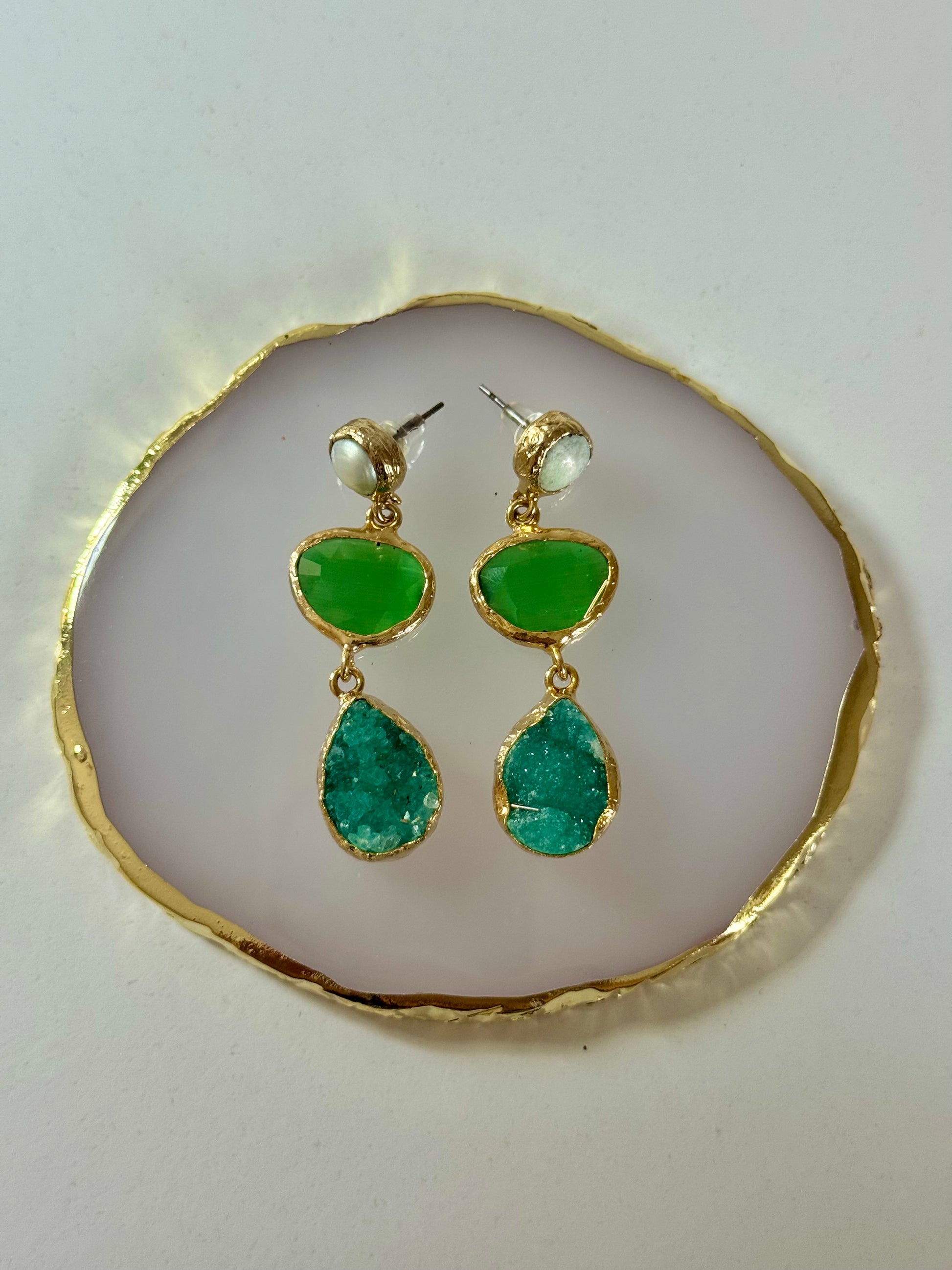 Elegantní a nepřehlédnutelné náušnice, které kombinují třpytivý přírodní drúzový kámen s jemně broušenou pryskyřicí v sytě zeleném odstínu a perleťovým detailem. Rámování ve zlaté barvě podtrhuje ruční zpracování a dodává šperku bohémský nádech.