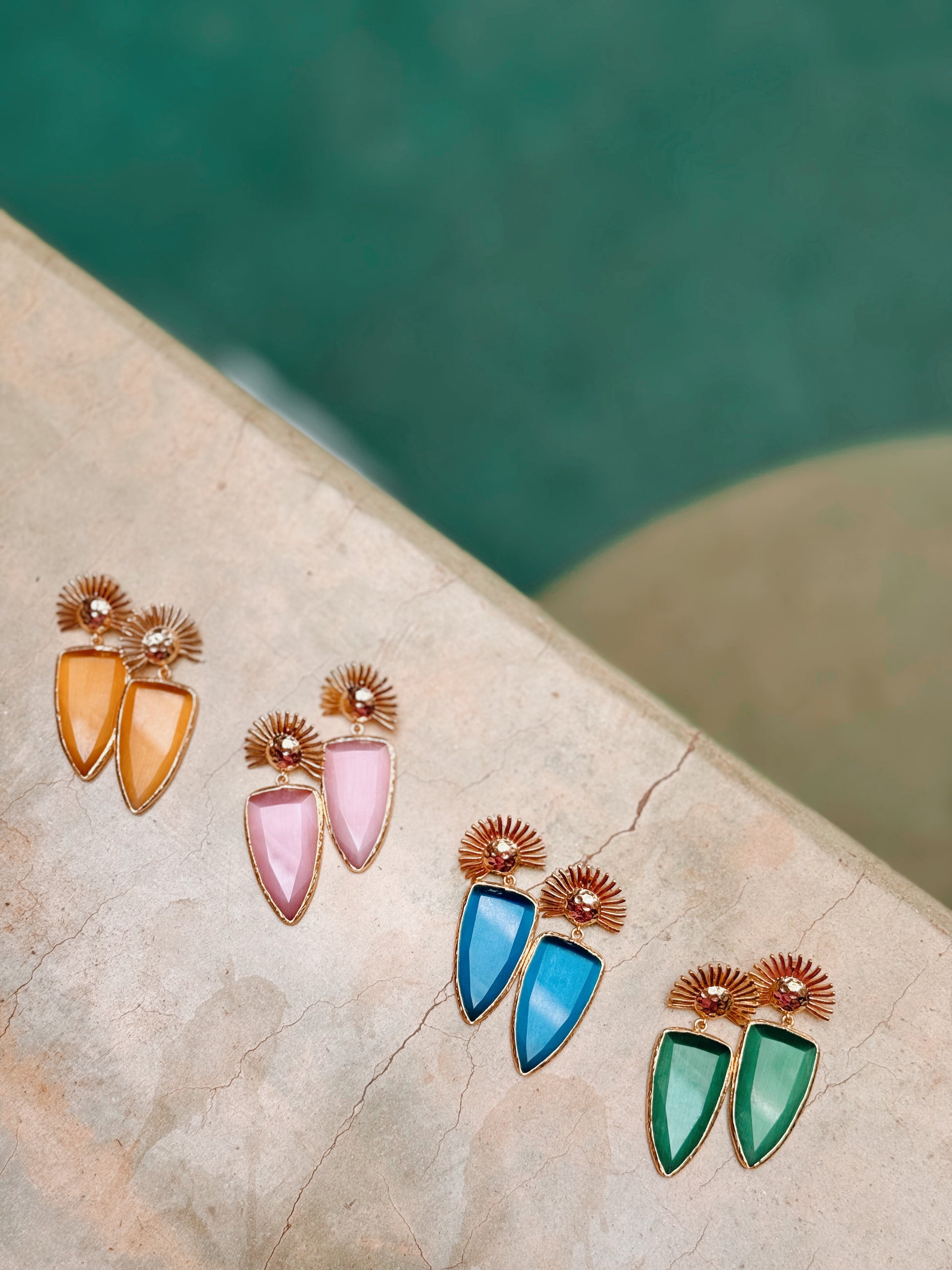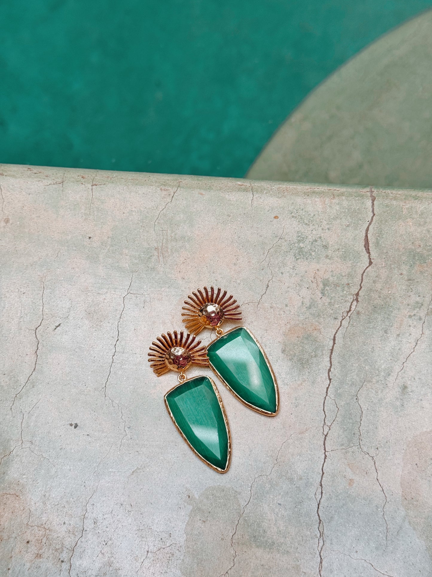 Rozzařte každý den s těmito originálními náušnicemi inspirovanými sluneční energií! Kombinace elegantní zelené barvy a teplého mosazného tónu vytváří harmonii, která zaujme na první pohled.