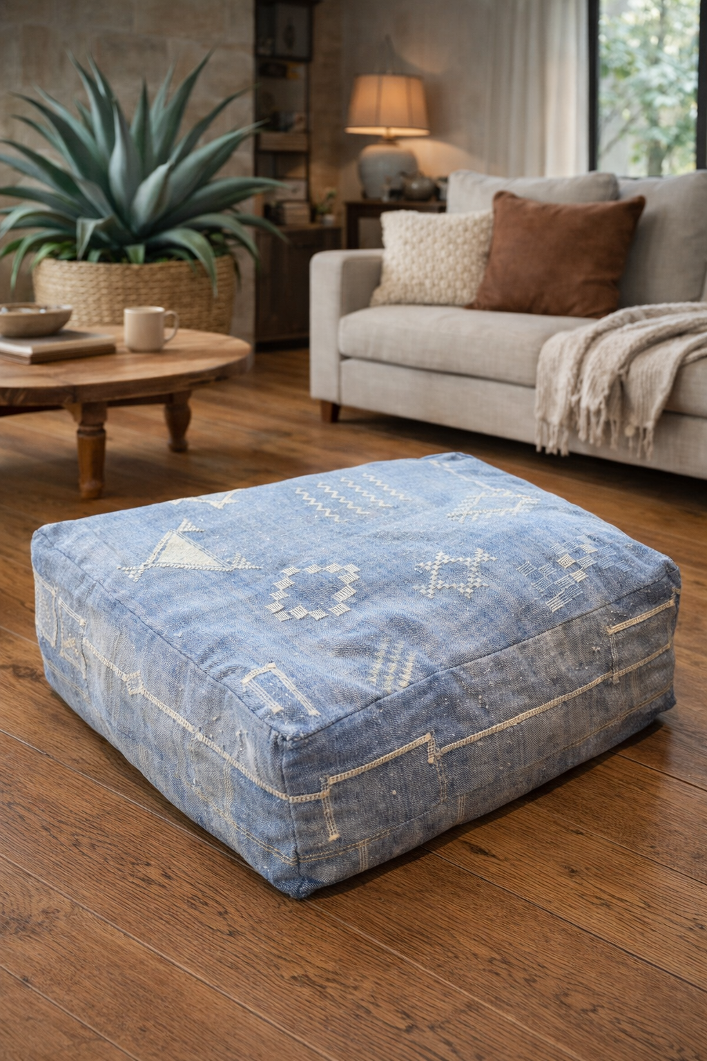 Pouf z kaktusového hedvábí, vyrobeno z agáve, v barvě vyprané džínoviny.