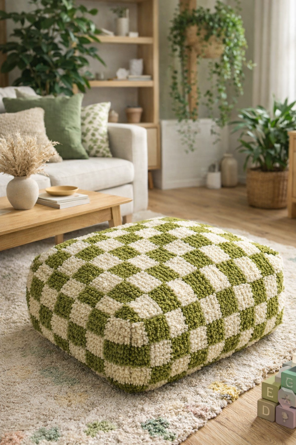 Přineste do svého interiéru útulnost a hravost s tímto originálním sedacím pufem v nadčasovém kostkovaném vzoru. Každý kus je ručně vyroben z kvalitního koberce z ovčí vlny, technikou ručního vázání, která zajišťuje nejen krásný vzhled, ale i dlouhou životnost a měkký, příjemný povrch.