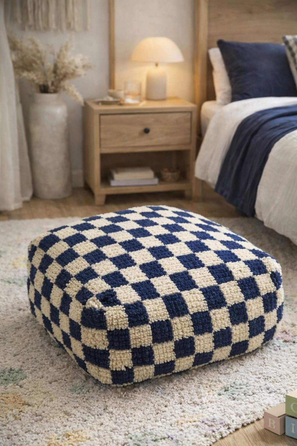 Přineste do svého interiéru útulnost a hravost s tímto originálním sedacím pufem v nadčasovém kostkovaném vzoru. Každý kus je ručně vyroben z kvalitního koberce z ovčí vlny, technikou ručního vázání, která zajišťuje nejen krásný vzhled, ale i dlouhou životnost a měkký, příjemný povrch.