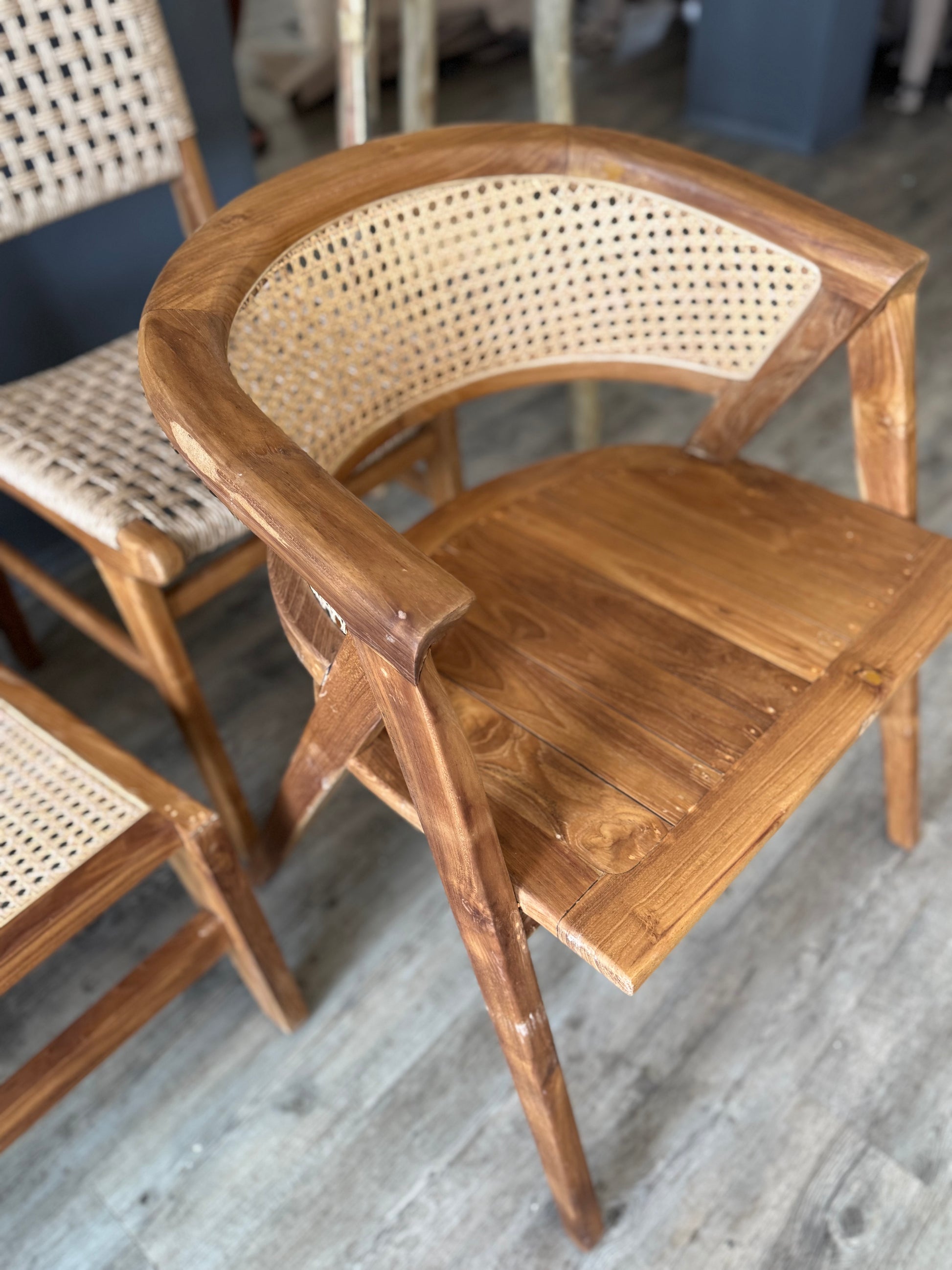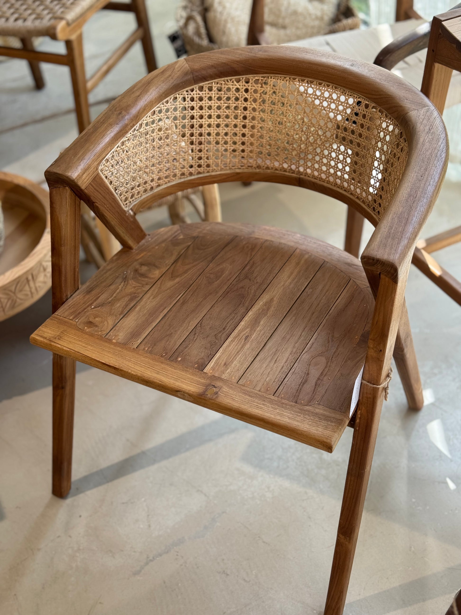 Stylová a pohodlná židle z masivního teakového dřeva s elegantním ratanovým výpletem v opěrce je ideálním doplňkem pro interiér i kryté venkovní prostory. Díky kombinaci přírodních materiálů působí židle nadčasově a lehce.